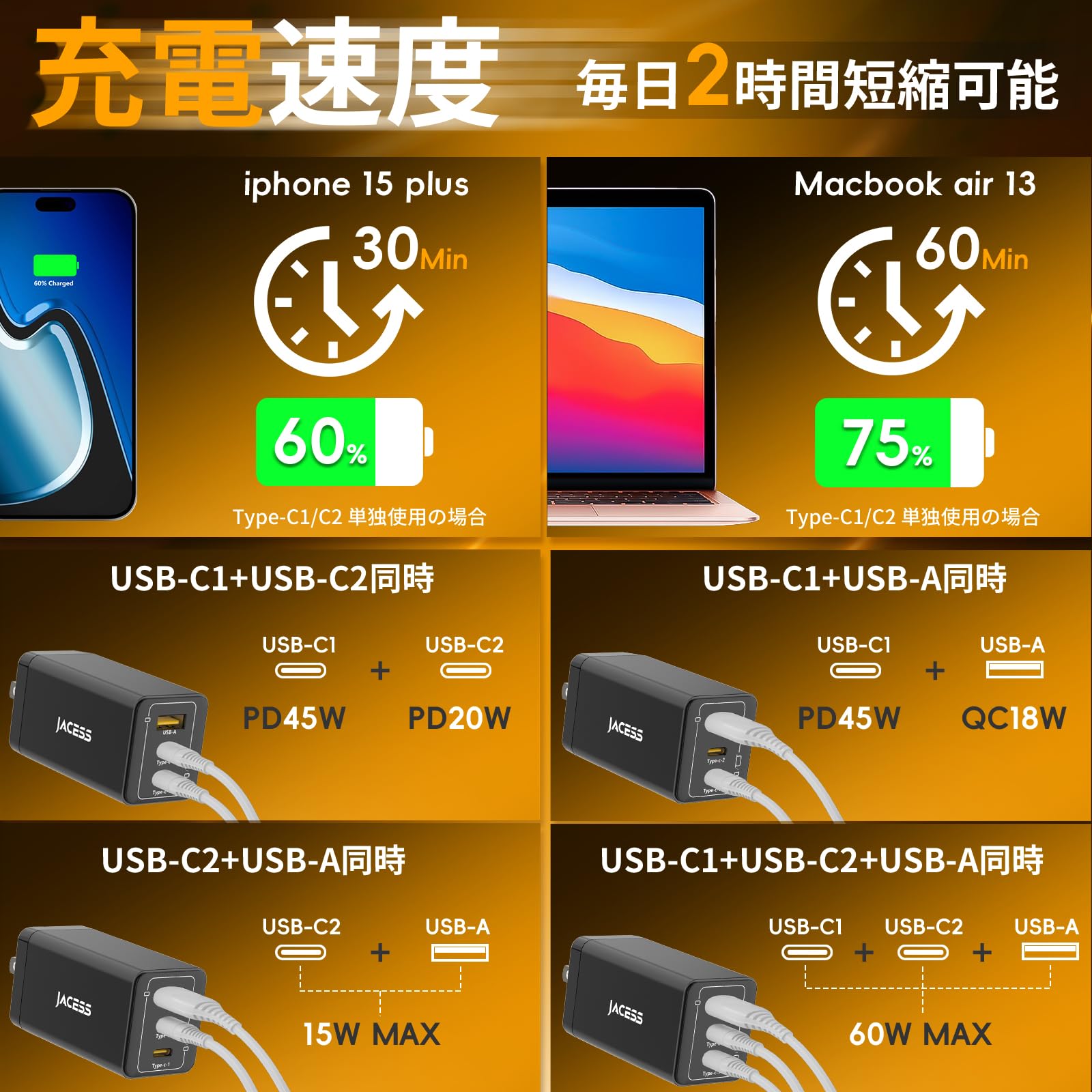 ■ 【長時間の充電待ちにさようなら!65W急速充電器・複数デバイスを同時に急速充電】長時間の待ち時間は人をいらいらさせますか? それなら、当社のType-C充電器は間違いない選択です! Jacess PD充電器は2025年初めに新たにアップグレードされ、どのCポートでも65Wの出力が可能です。