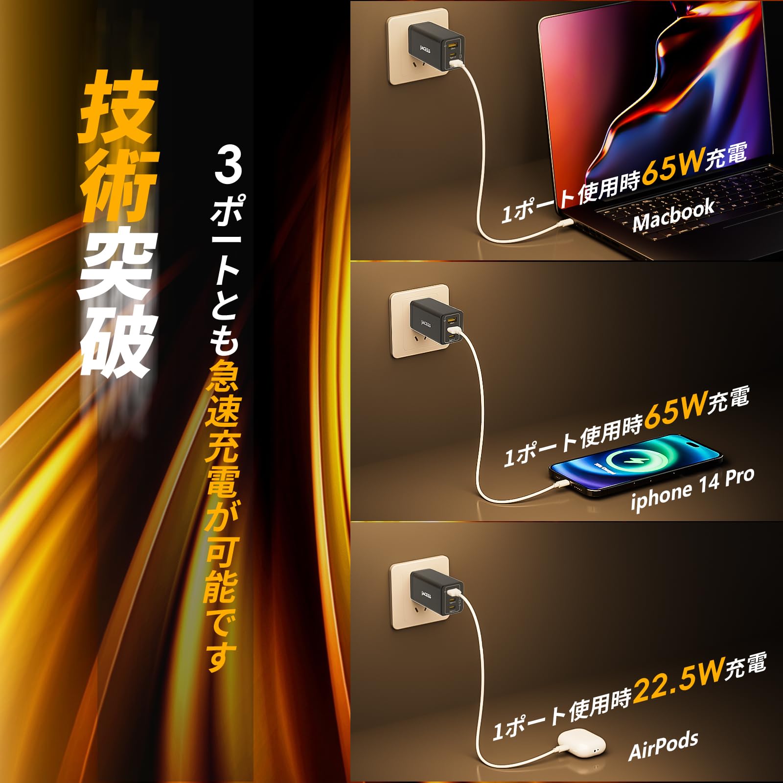 驚異的な充電速度で瞬時に電池を満充電に!遅い充電にさようなら!他の充電器と比較して、本充電器は3つの出力ポートすべてで複数のデバイスを同時に急速充電できます!ぜひ当社の65W PD急速充電器を体験してください。