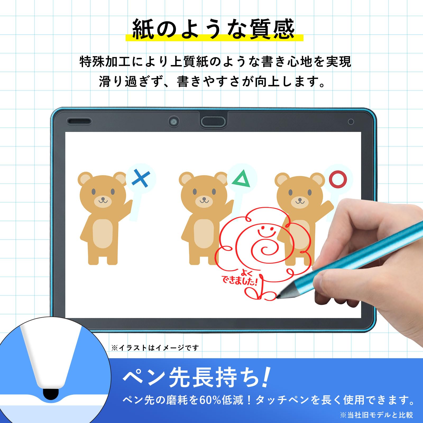 【ペン先の磨耗を低減】最新素材を採用した表面特殊加工により、ペン先の磨耗を従来製品より、60%低減させることで、タッチペンを長く使用できます。