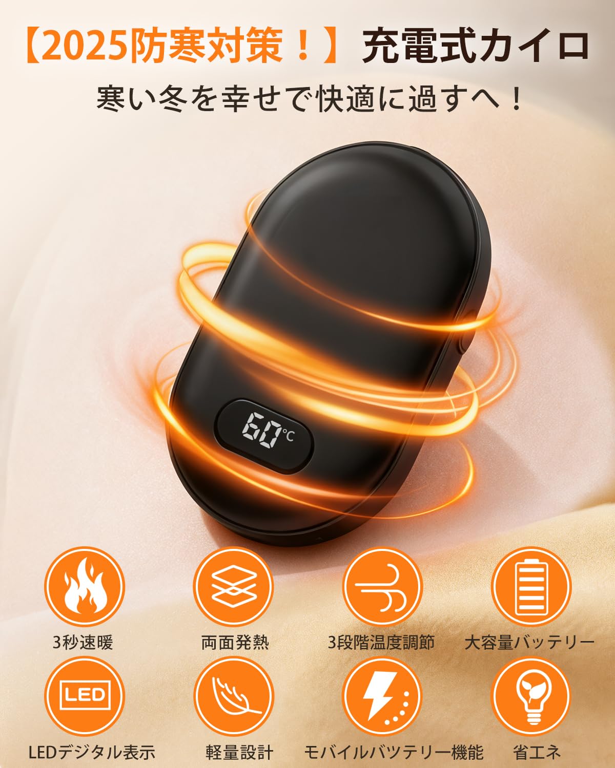 ■ 【急速発熱】充電式カイロは両面発熱機能を備えており、3秒で急速に発熱し、いつでもどこでも温かさを楽しむことができます。