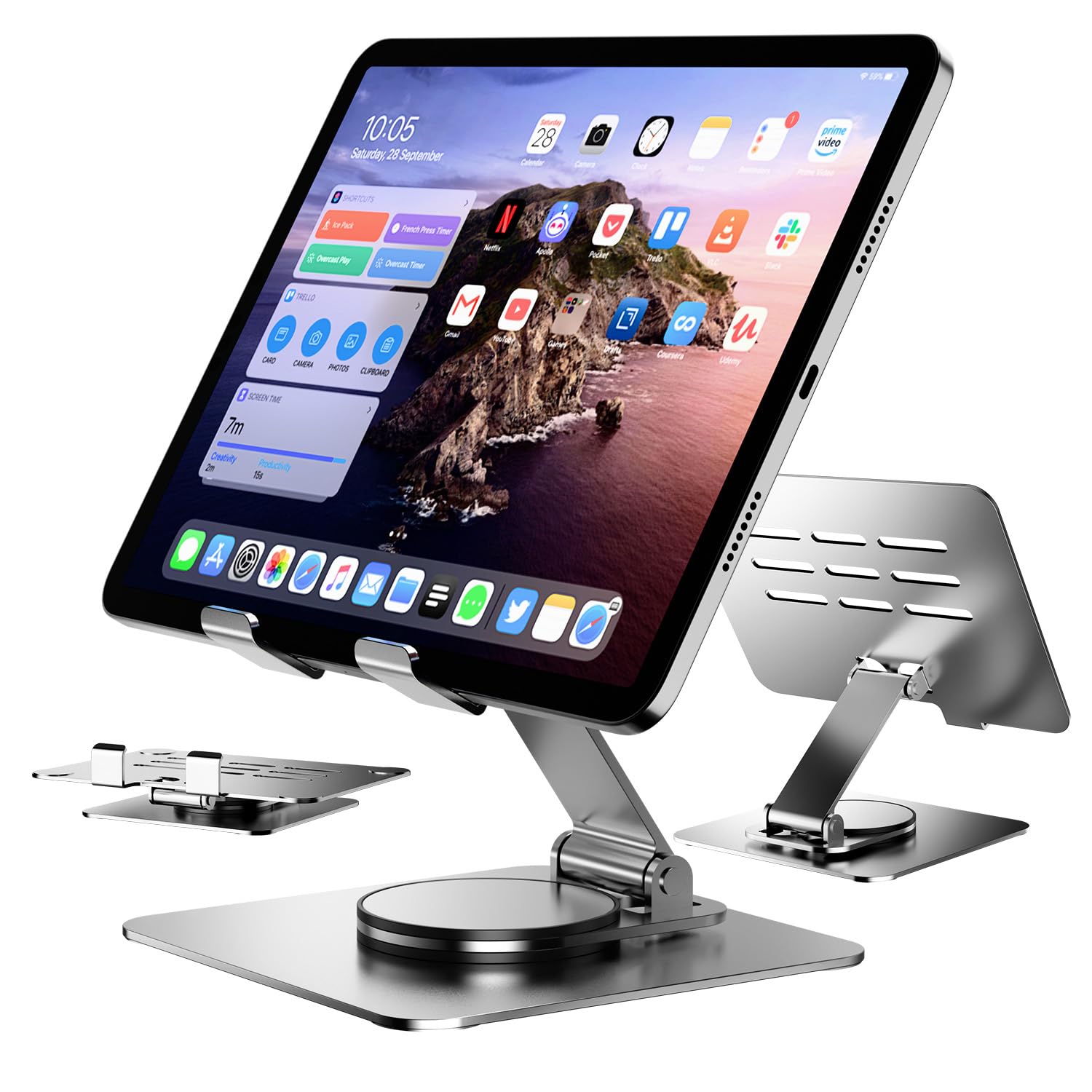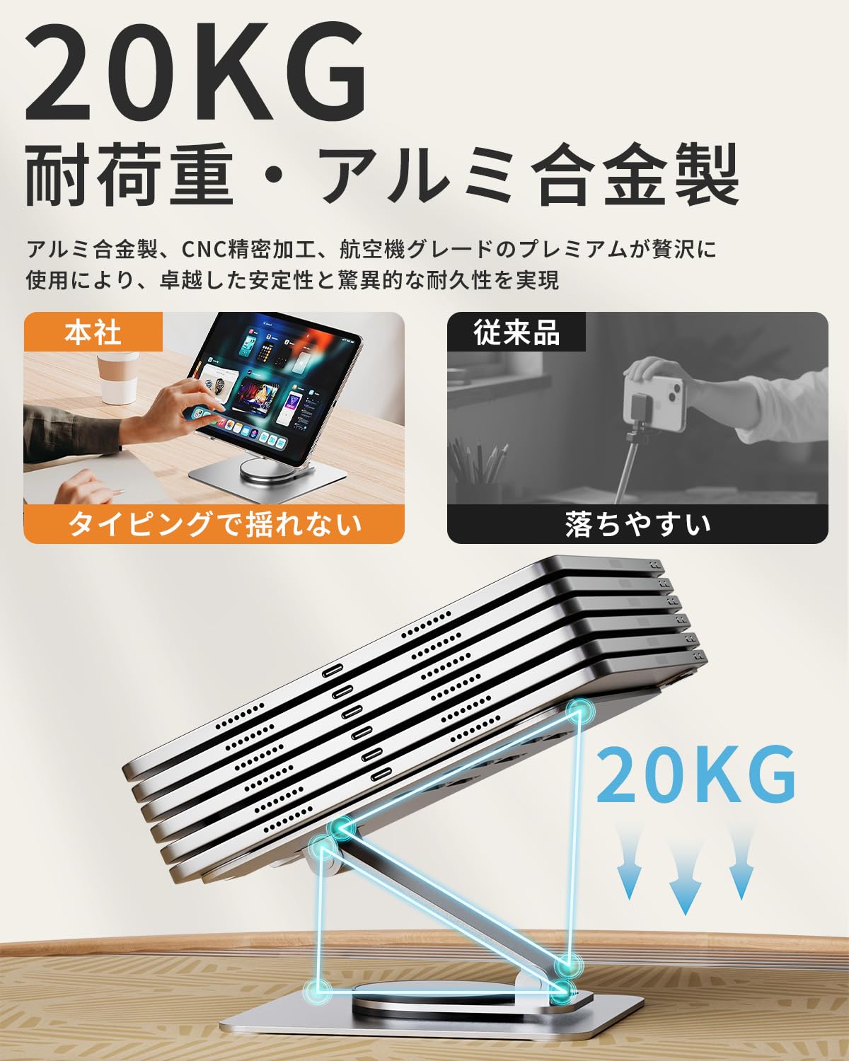 【2025新登場・360°回転・折り畳み式】 タブレット スタンド iPad スタンド 4.7~13インチ対応 軽量 高さ 角度調整 滑り止め 放熱 通気性 安定性 タブレット/スマホホルダー デスクホルダー アルミ合金製 卓上縦置き 人間工学設計 iPad/Switch/Kindle/Fire HD/Android/タブレット対応 携帯便利 (シルバー)