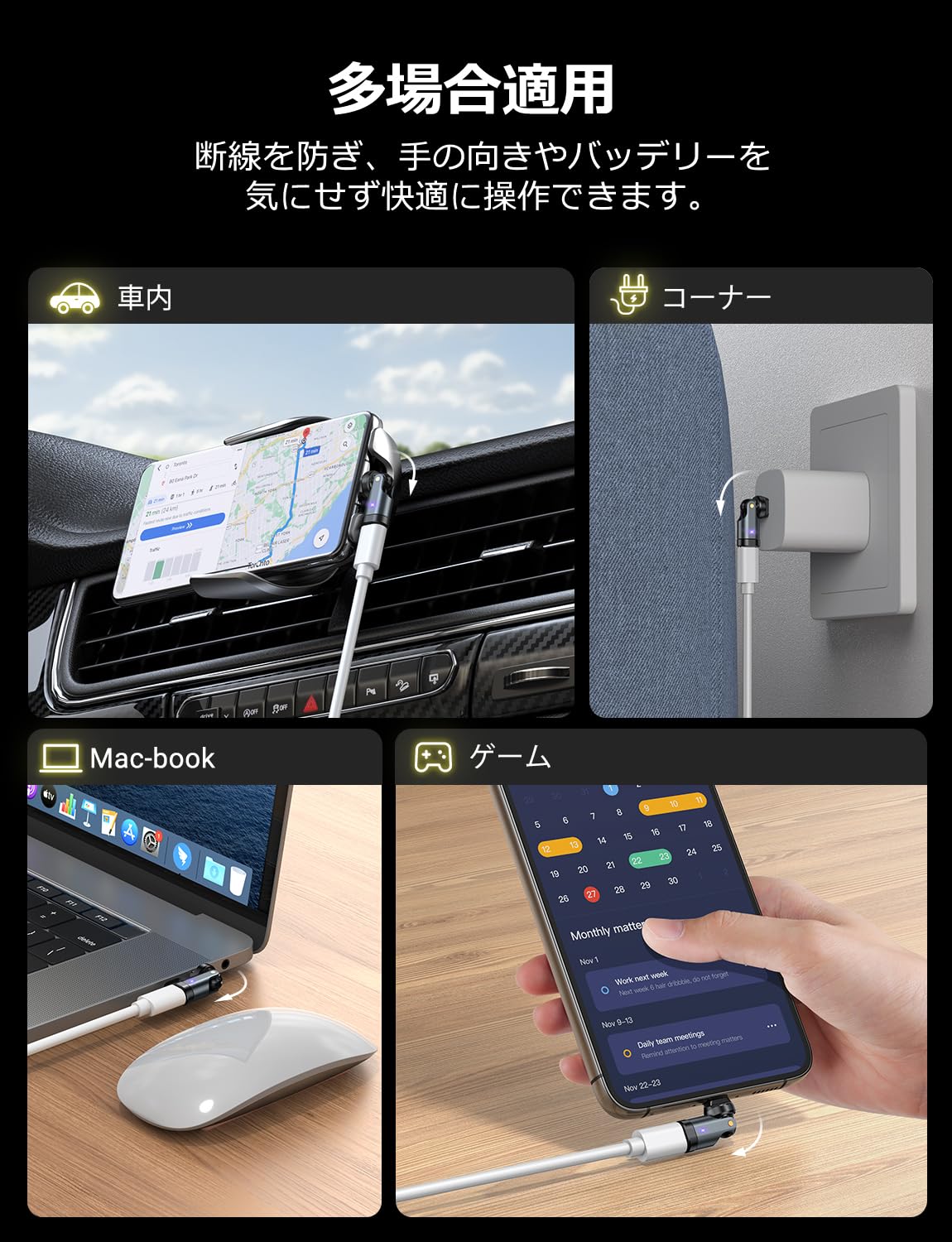 また、異なる長さの充電ケーブルに対応しているため、どんなシチュエーションでも便利に活用できます。