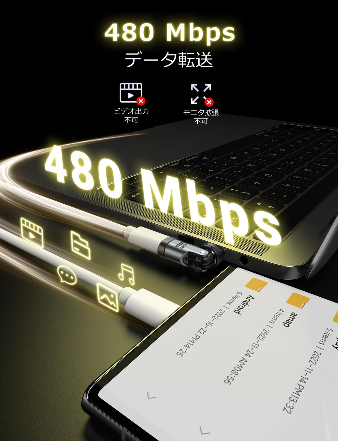 また、データ転送速度は最大480Mbpsに達し、大容量ファイルの転送もスムーズに行えます。
