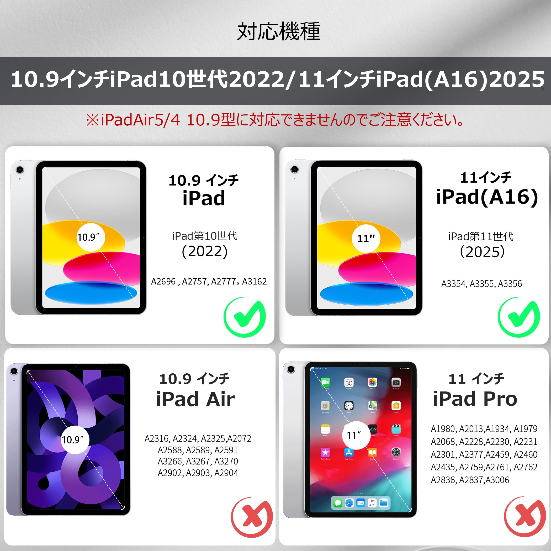 ■ 【対応機種】iPad (A16) 11インチ 第11世代 2025(モデル番号:A3354/A3355/A3356)、iPad 第10世代 2022 10.9インチ(モデル番号:A2696/A2757/A2777)向けに専用設計された半透明ハードケースです。