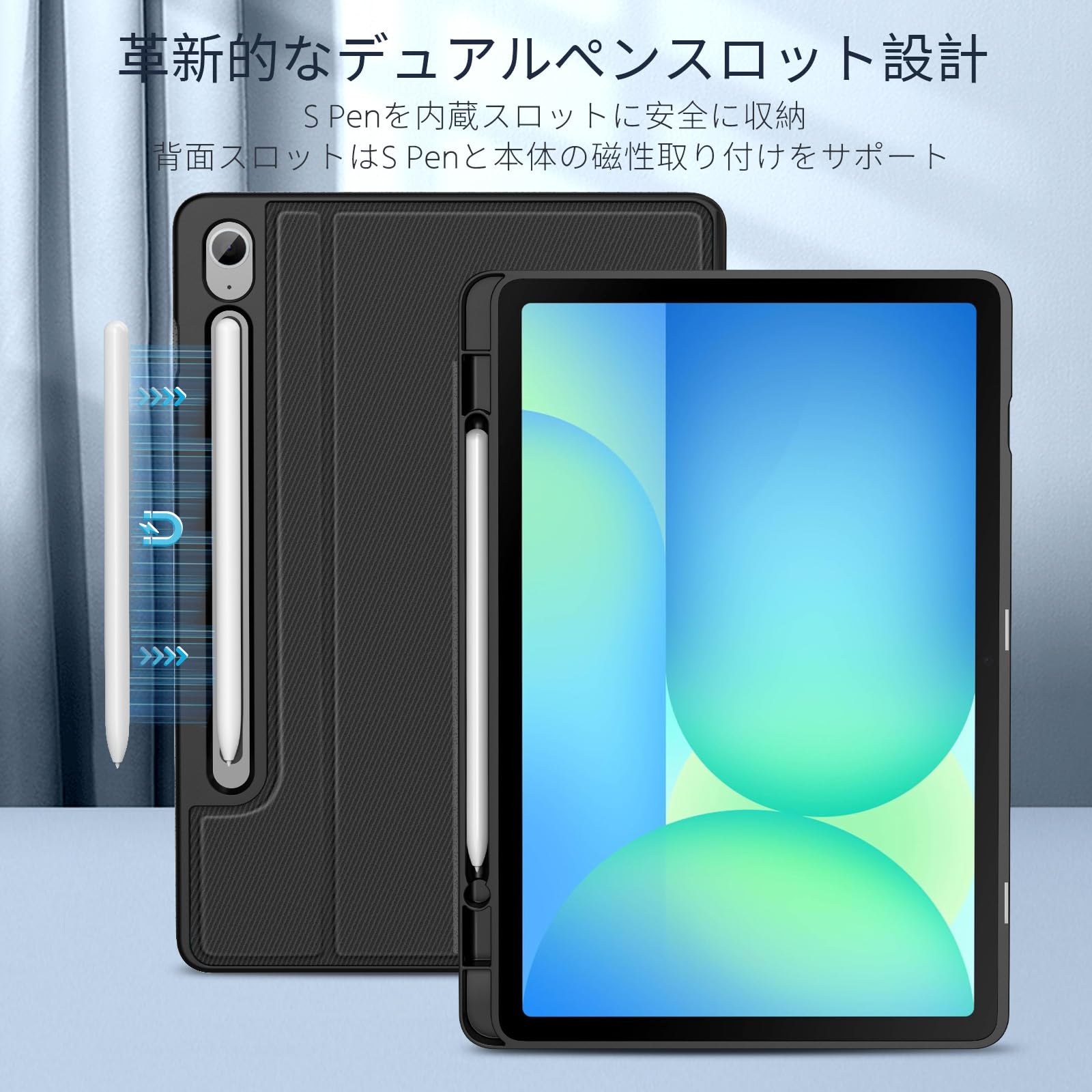 ■ 「Sペンの取付に対応」専用設計された全面保護ケースとなっているため、Sペン専用の収納ホルダーを内蔵しており、Sペンを安全に携帯できるだけでなく、タブレット背面の磁気吸着機能とも完全に対応してくれます。