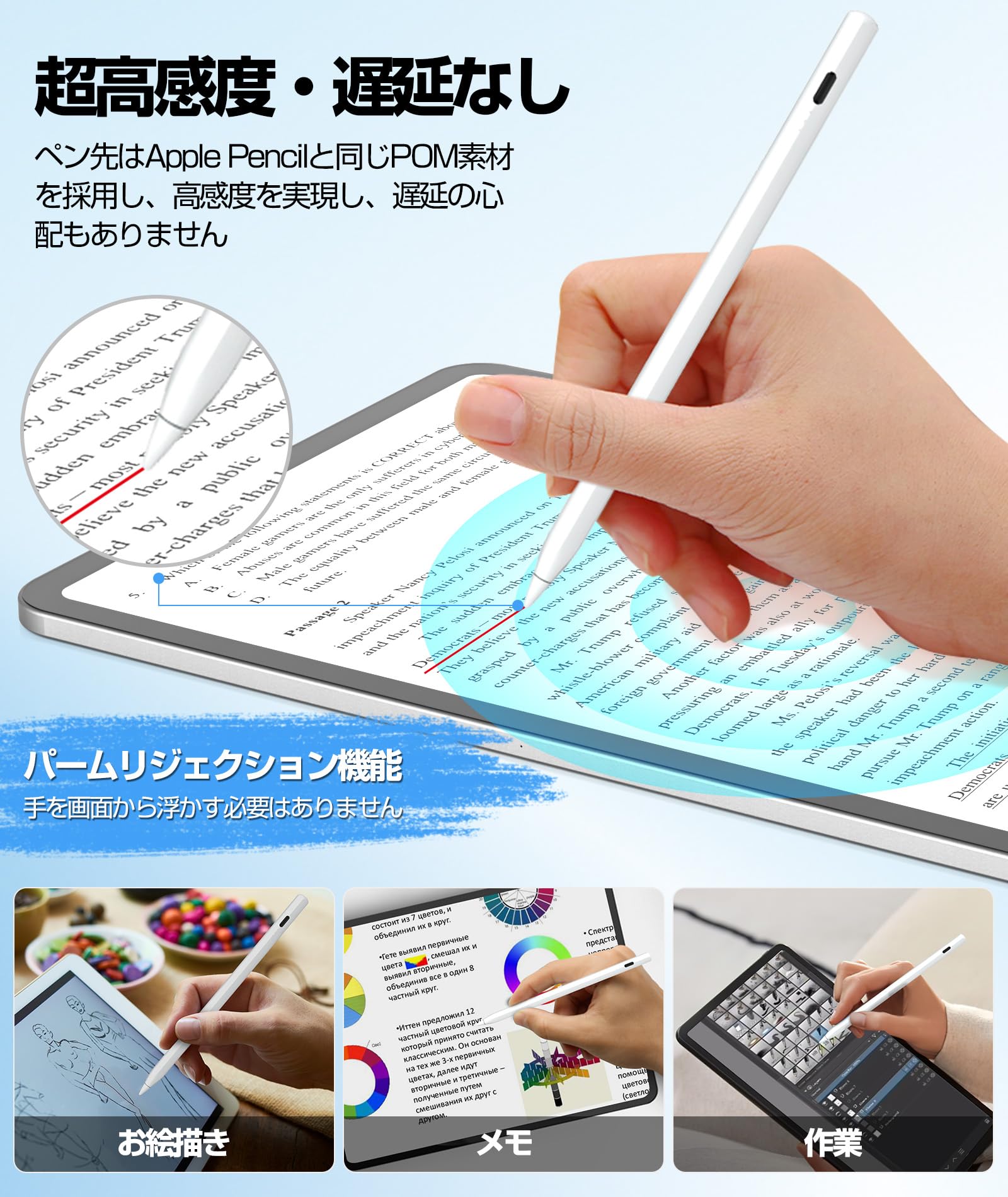 さらに、パームリジェクション機能も装備されているため、手のひらを画面につけたままでも誤動作なし!長時間作業しても腕が疲れません。
