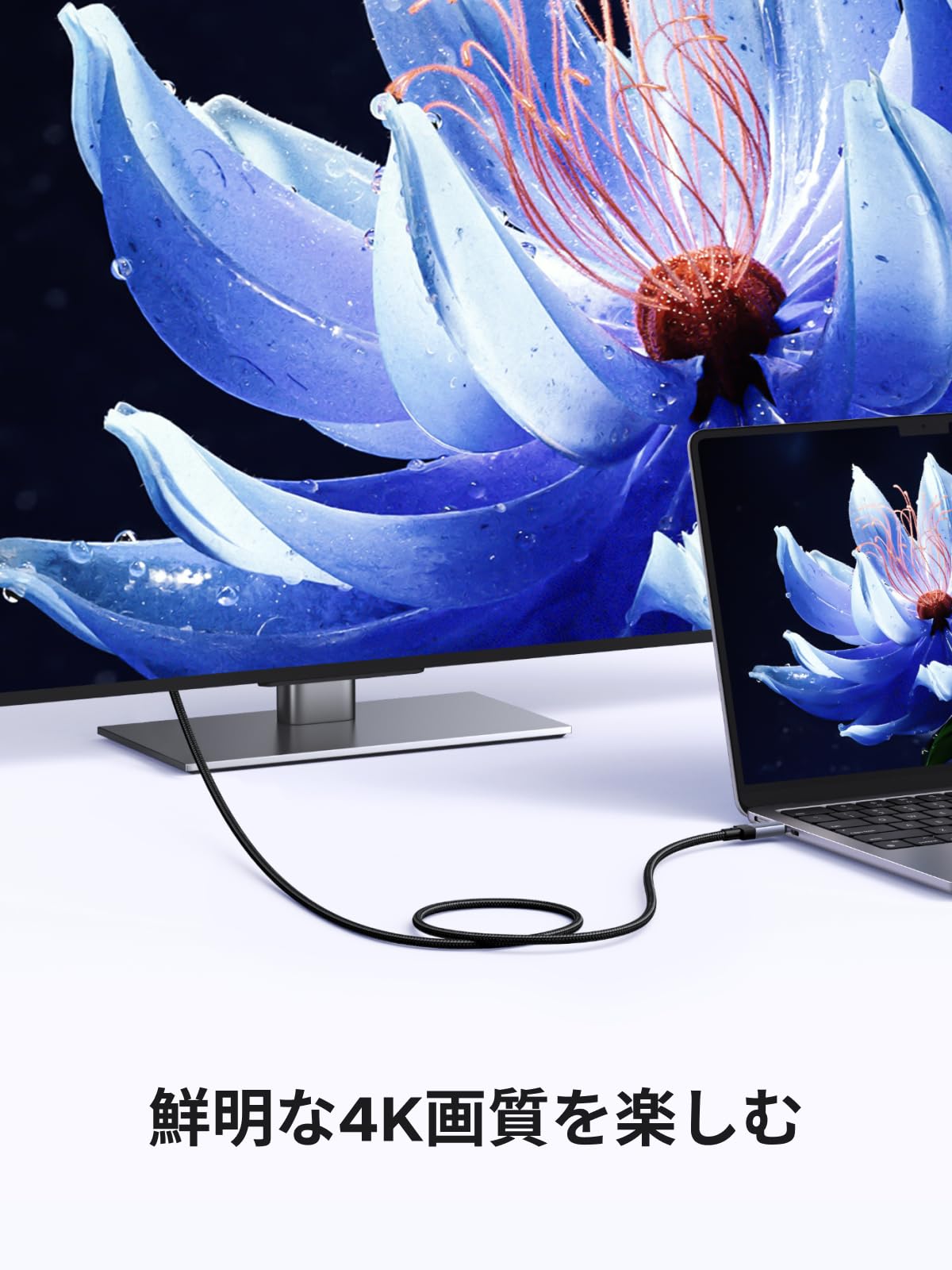 フルHD1080Pの4倍の解像度を誇り、4K ディスプレイでより精細なディテール、リアルな色彩、臨場感あふれる映像を捉えるUSB-Cモニターケーブルです。