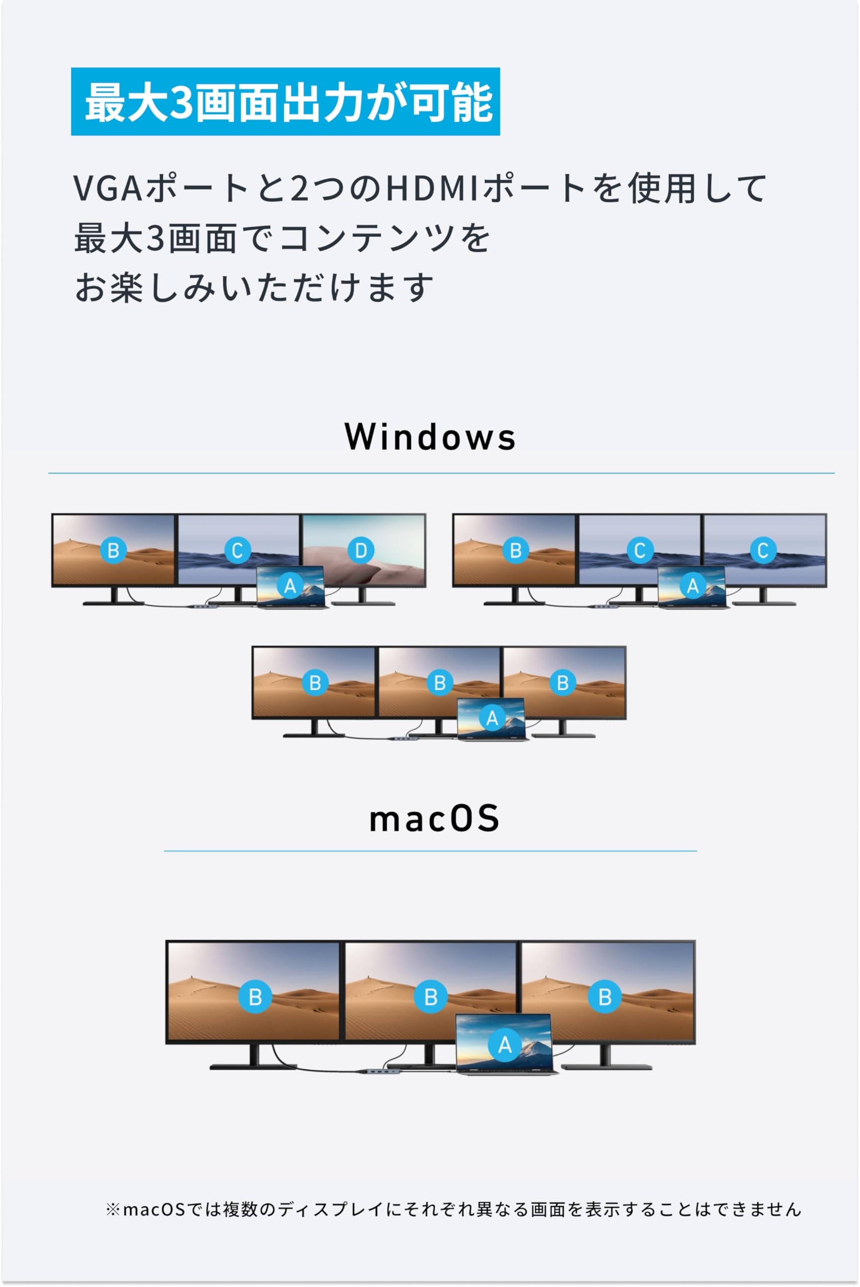 ■ 鮮やかな高画質出力と最大3画面出力が可能:VGAポートと2つのHDMIポートを使用して最大3画面でコンテンツをお楽しみいただけます。