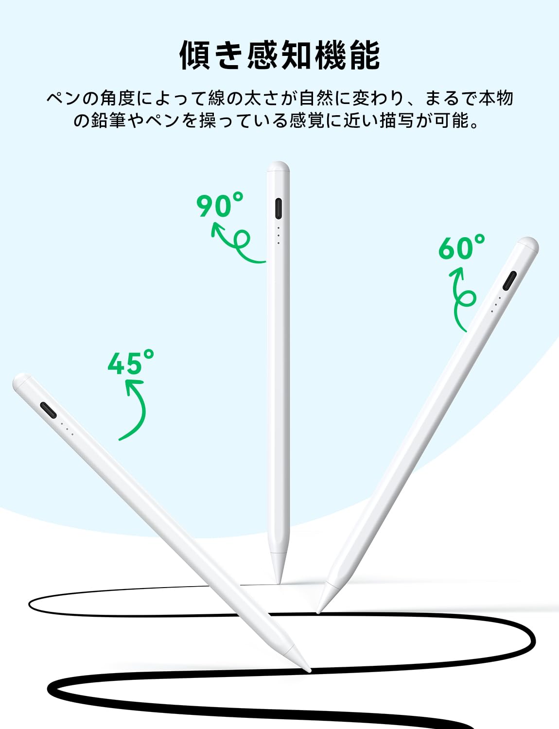 傾きを感知により、スタイラスを異なる角度で傾けることで、線の太さやシェーディングのバリエーションを正確に制御できます。