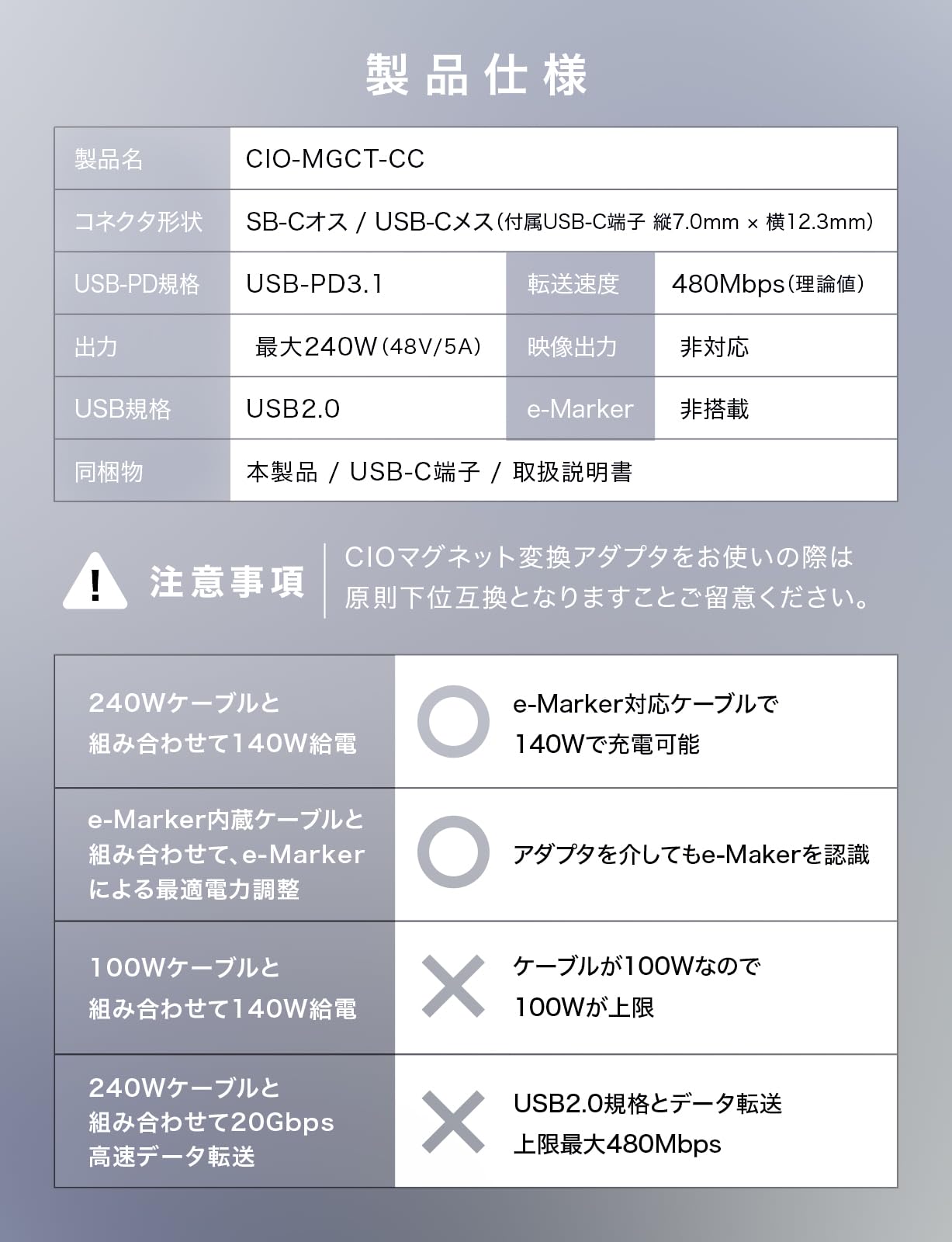※e-Marker非搭載ですが、e-Marker内蔵のケーブルと組み合わせてご使用いただくことでe-Markerを認識し、最適電力調整に対応いたします。