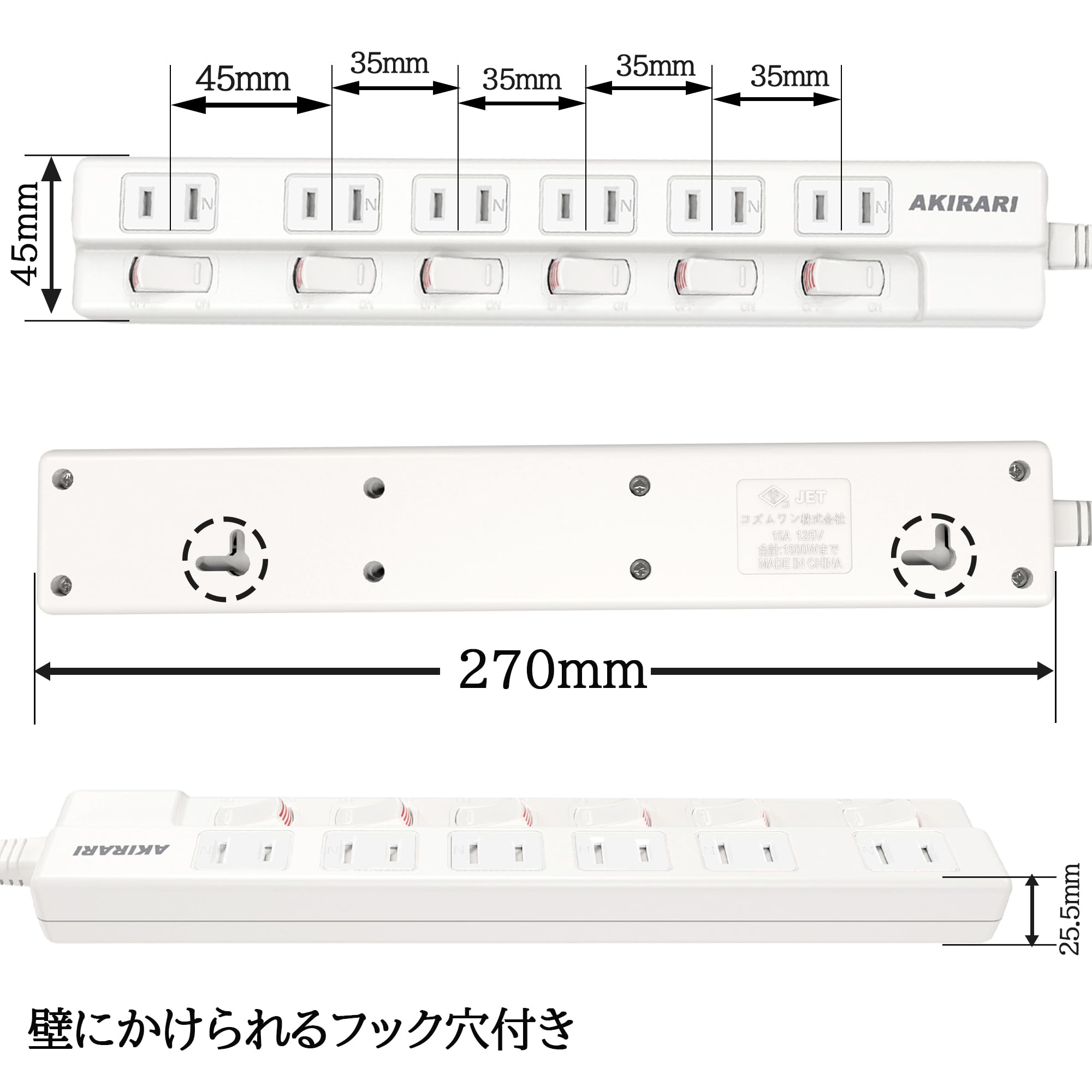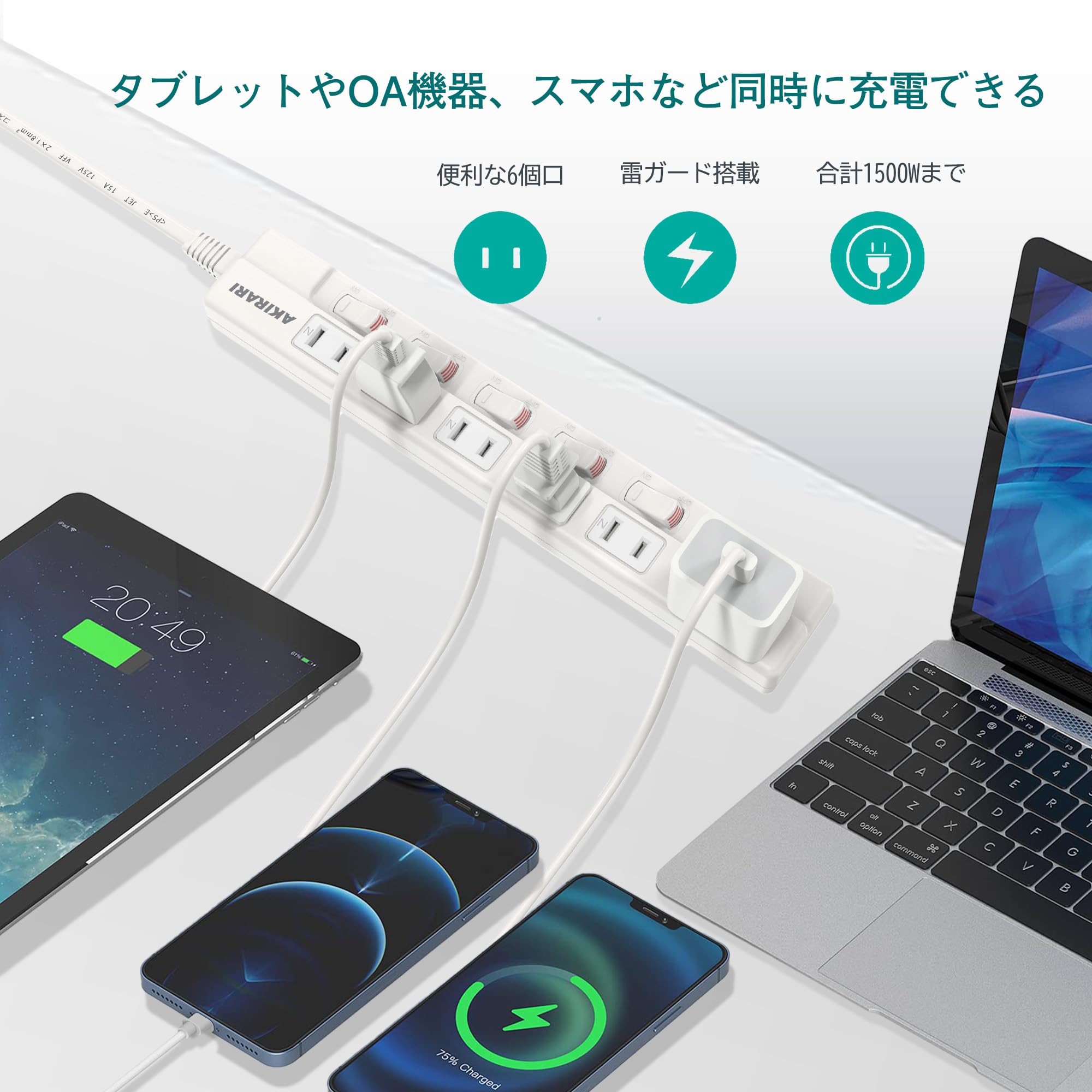 【防塵防雷 個別スイッチ】 電源タップ 6口 2M AKIRARI コンセントタップ ホワイト 雷ガード スイッチ電源タップ テーブルタップ 延長ケーブル 家庭用 6個口 ほこりシャッター付 過電流 過熱保護 すき間 180度スイングプラグ トラッキング防止 節電 省エネ 延長コード おしゃれ 電源 壁 卓上 薄型 コンパクト (2M)