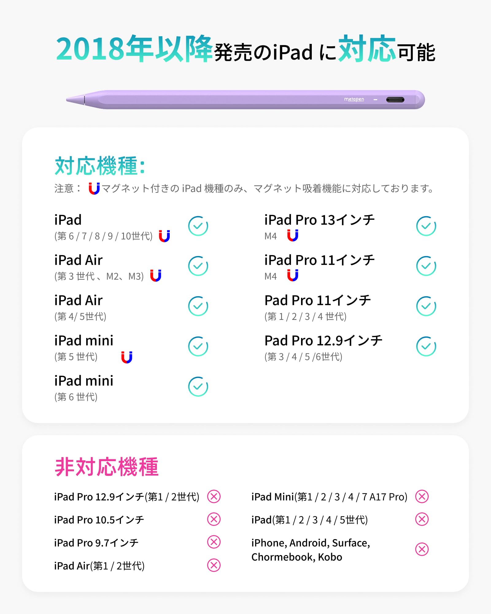 磁気吸着機能非対応: iPad Pro 13/11 inch(M4)、iPad Air 13/11 inch(M2)、iPad第6/7/8/9/10世代、iPad Air第3世代、iPad Mini第5世代。
