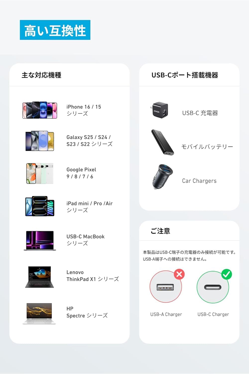 ■ 急速充電対応:最大60Wの高出力に対応し、ノートPCやタブレット端末、スマートフォン等の幅広いUSB-C機器に急速充電が可能です。