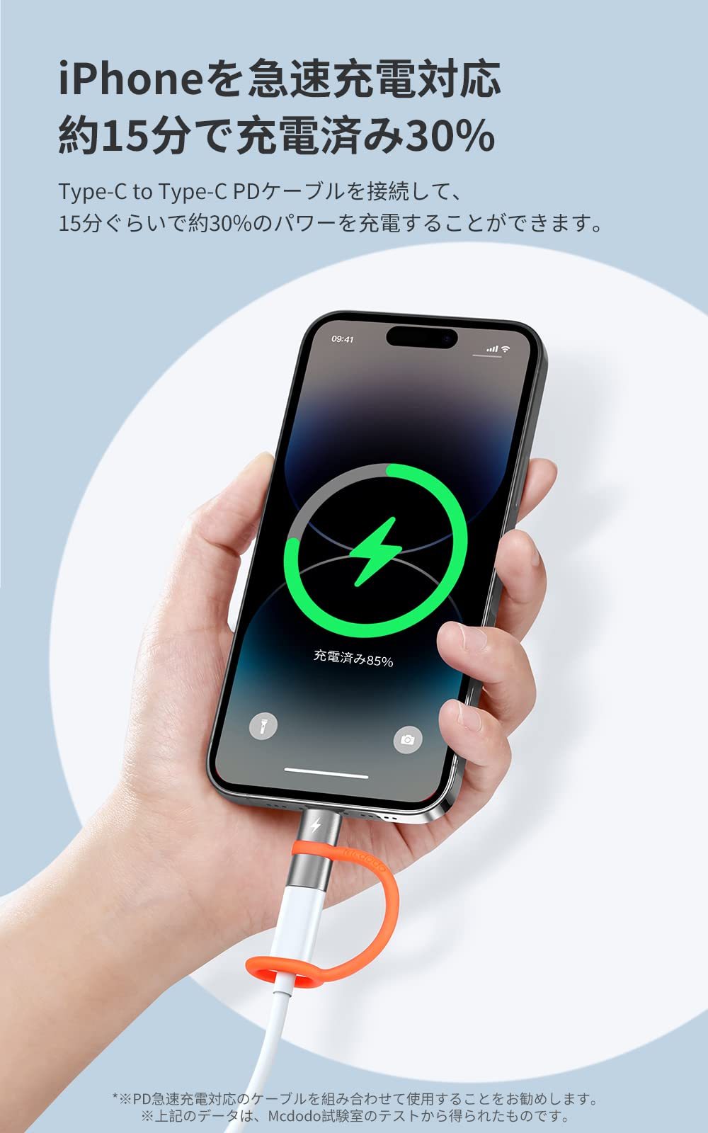 Type-C to Type-C PDケーブルを接続して、15分ぐらいでiPhoneへ約30%のパワーを充電することができます。