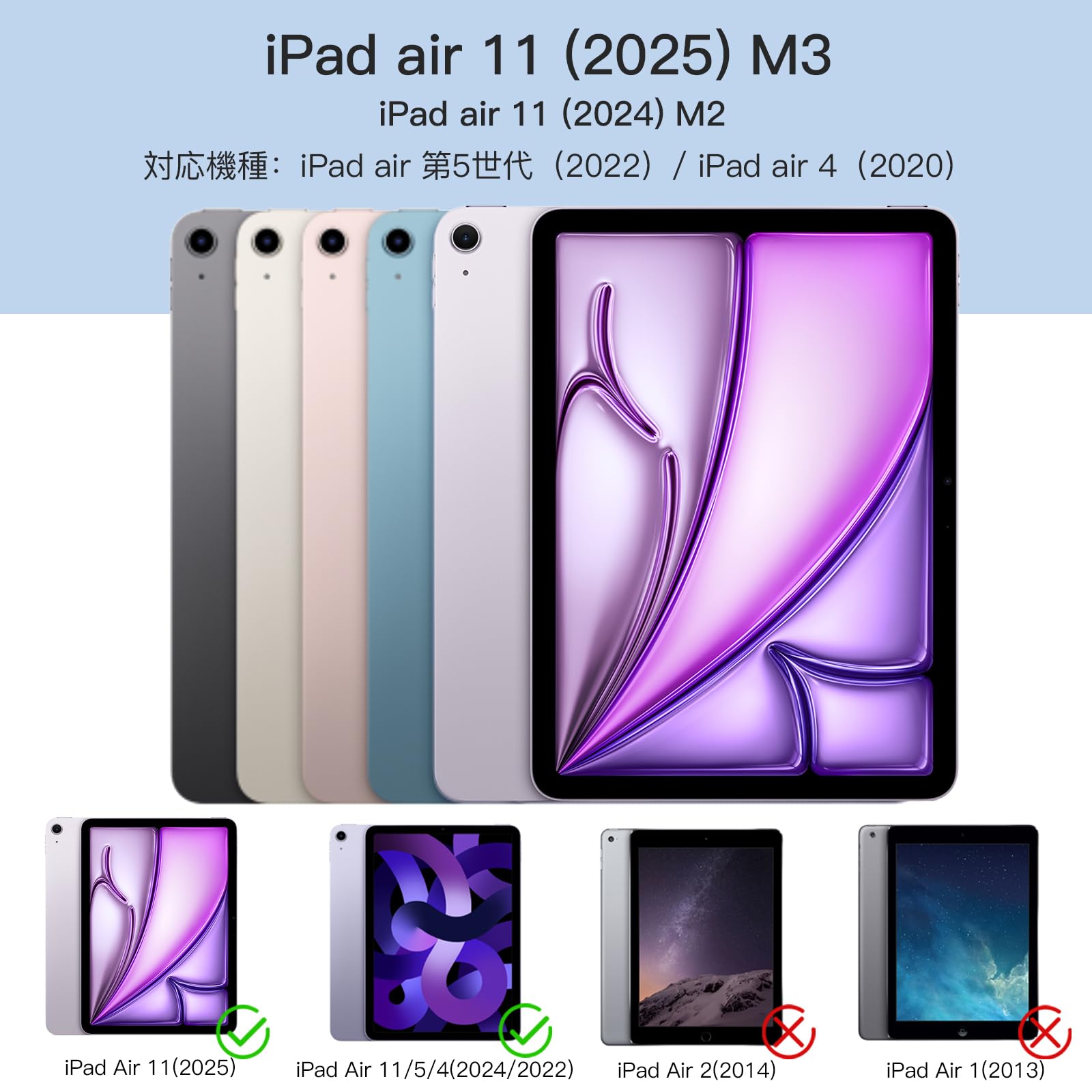 ■ 【対応機種】iPad Air 11インチ(2025 M3 A3266/A3267/A3270)(2024 M2 A2902/A2903/A2904)、iPad Air 第5/4世代(2022/2020)10.9/11インチケース (モデル番号:A2072/A2316/A2324/A2325)専用透明バックカバー。