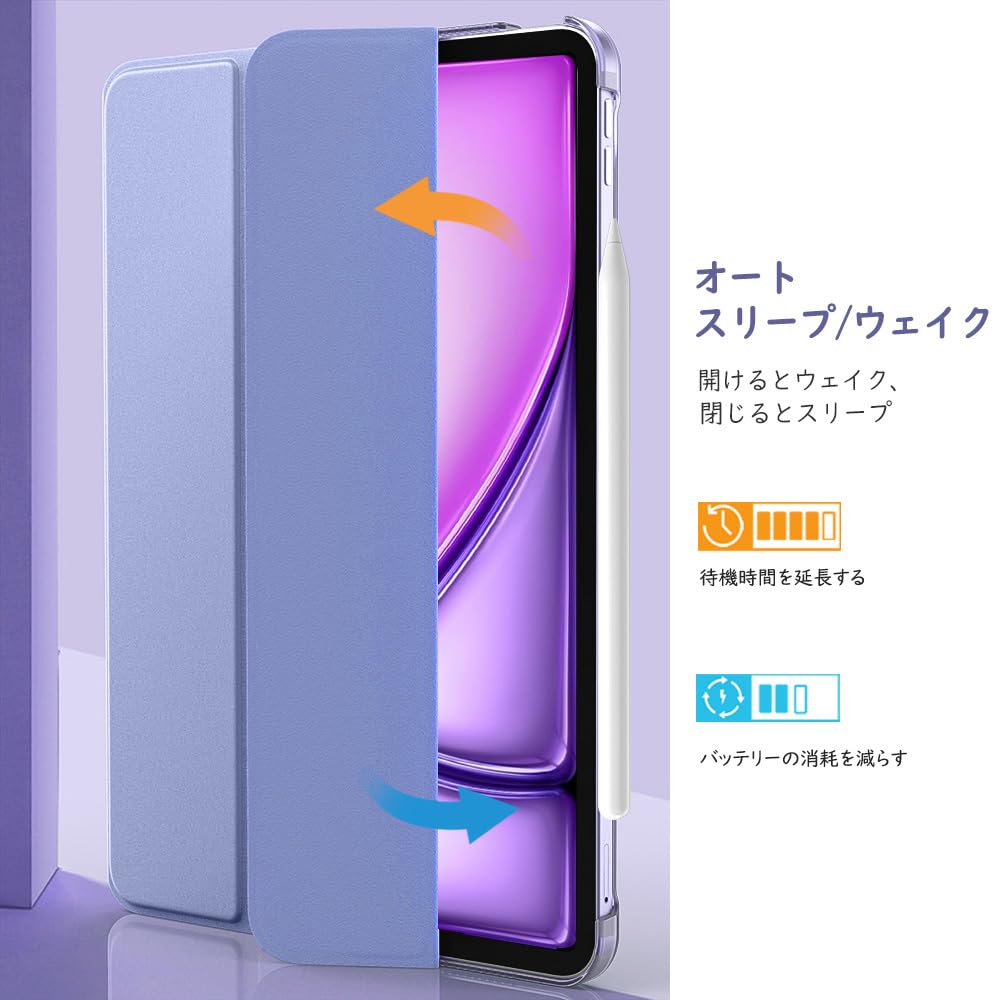 TiMOVO iPad Air 11インチ ケース M3/M2 第7/6世代 (2025/2024) iPad air 第5/4世代 ケース 10.9インチ iPadAir7/6/5/4 カバー 11インチ/10.9インチ PencilPro/第2世代ワイヤレス充電対応 PUレーザー 三つ折り オートスリープ機能 落下防止 手帳型 半透明 ラベンダー