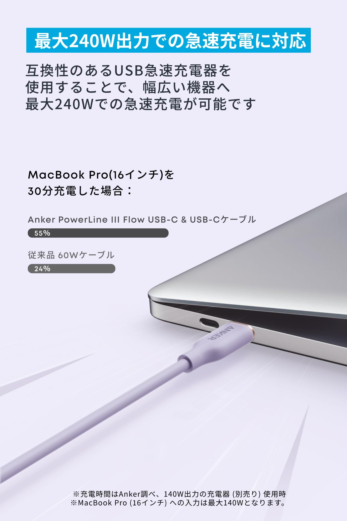 Anker PowerLine III Flow USB-C & USB-C ケーブル Anker絡まないケーブル PD対応 シリコン素材採用240W iPhone 17 / 16 / 15 Galaxy iPad Pro MacBookPro/Air 各種対応 (0.9m ライトパープル)