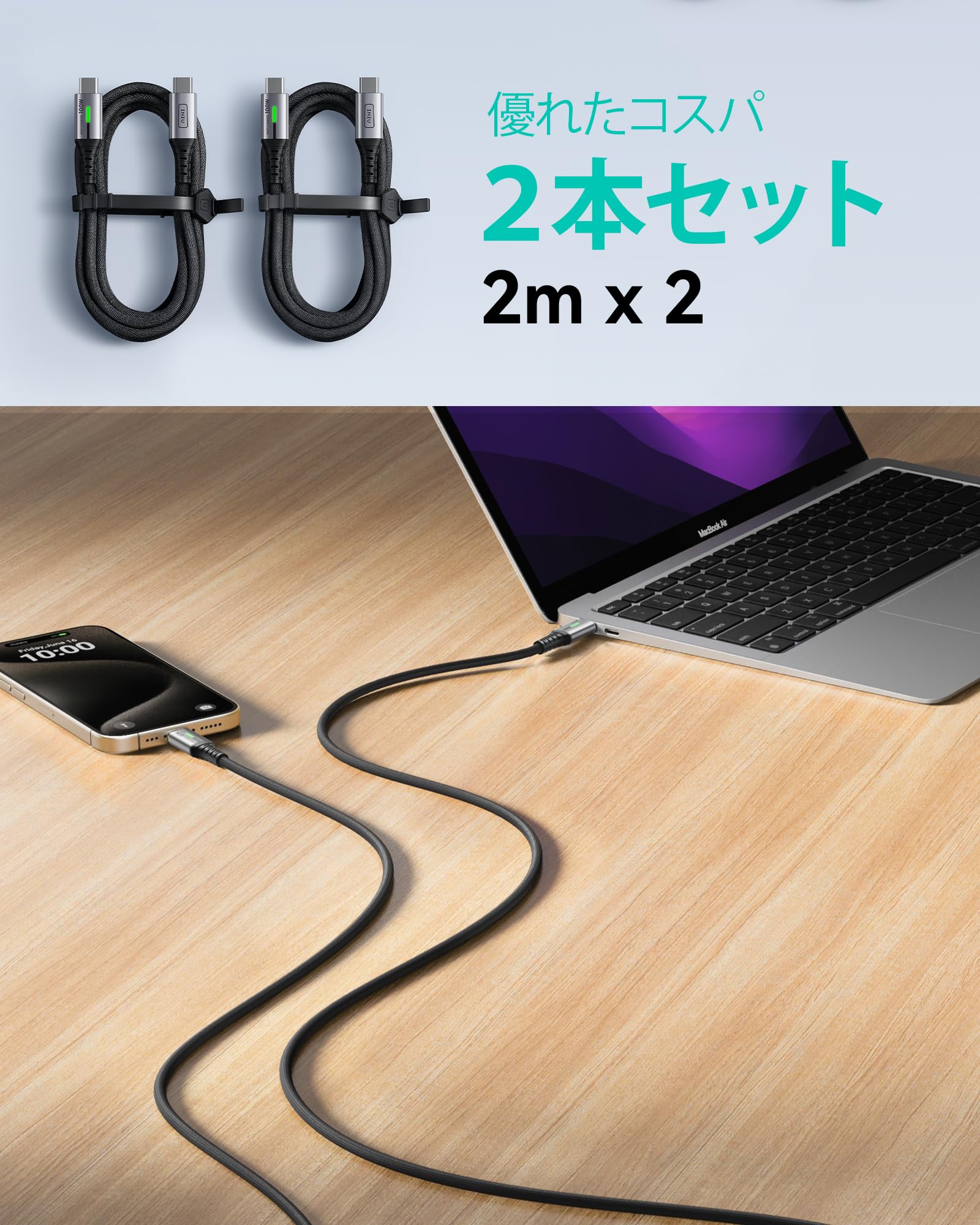 ■ 【パッケージ内容】2m USB-C to USB-Cケーブル×2、ケーブルストラップ×2、ユーザーマニュアル(日本語付き)×1、びライフタイムテクニカルサポート。