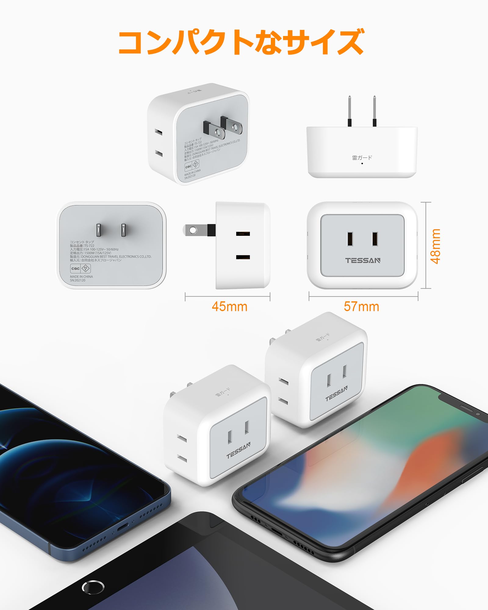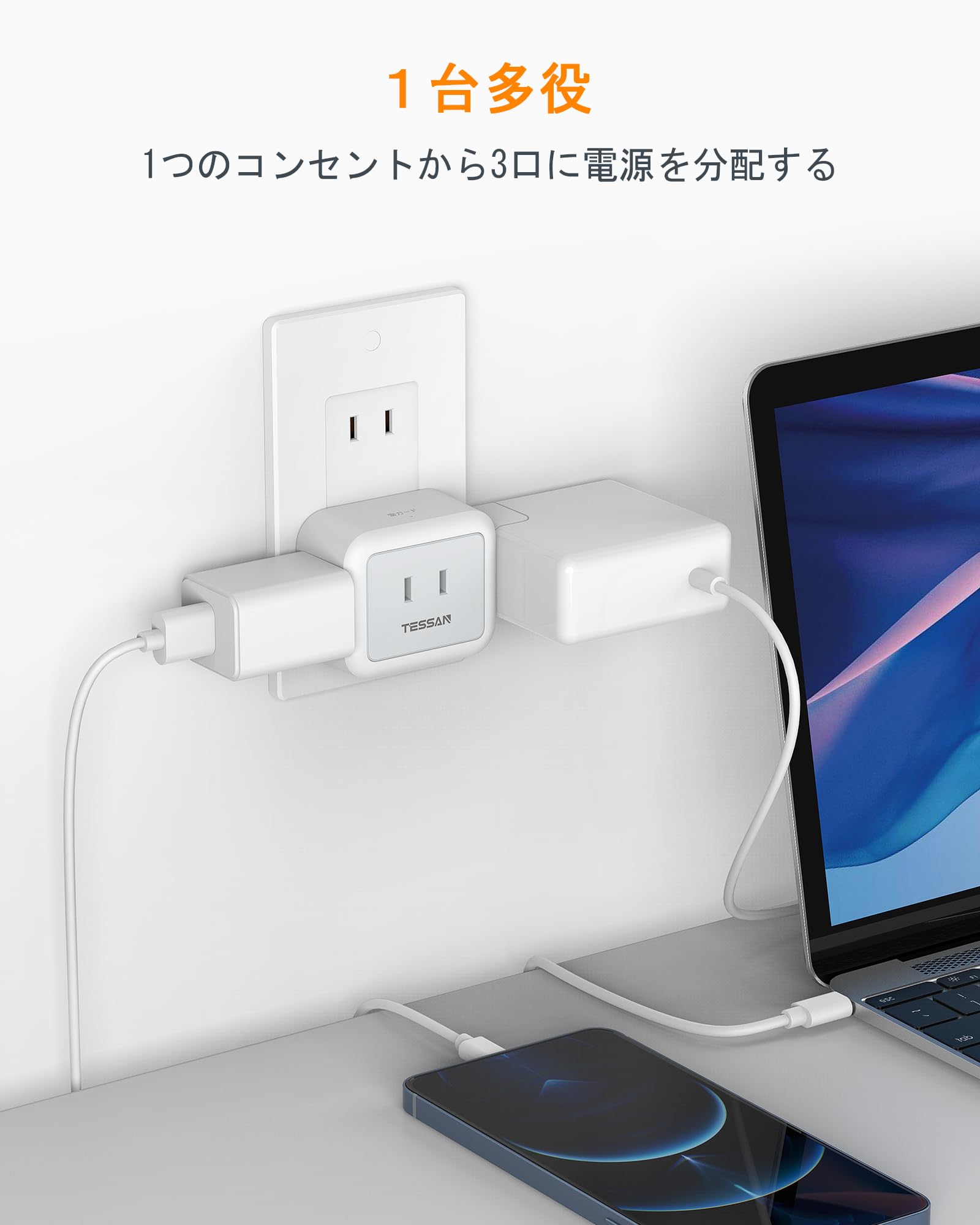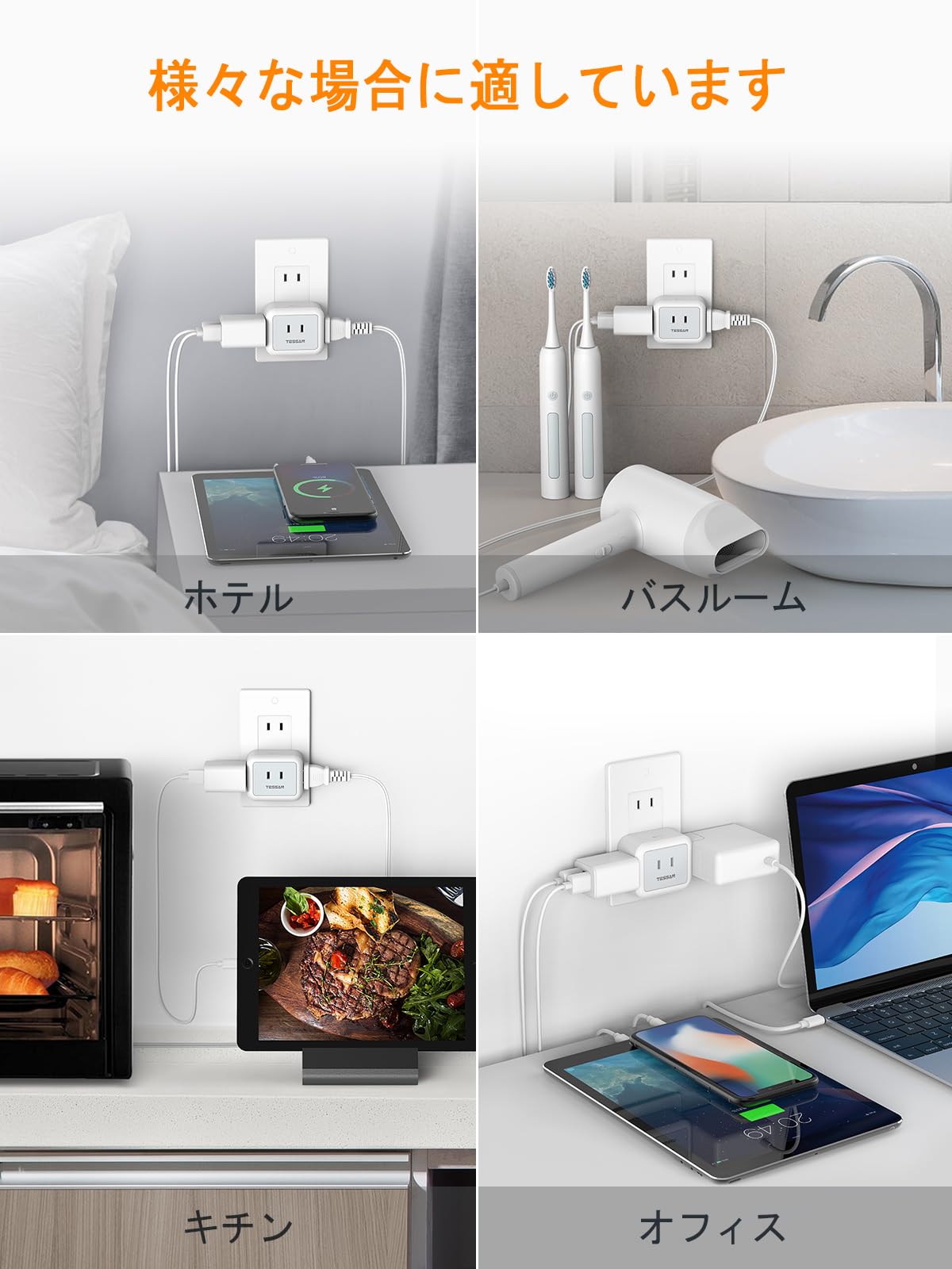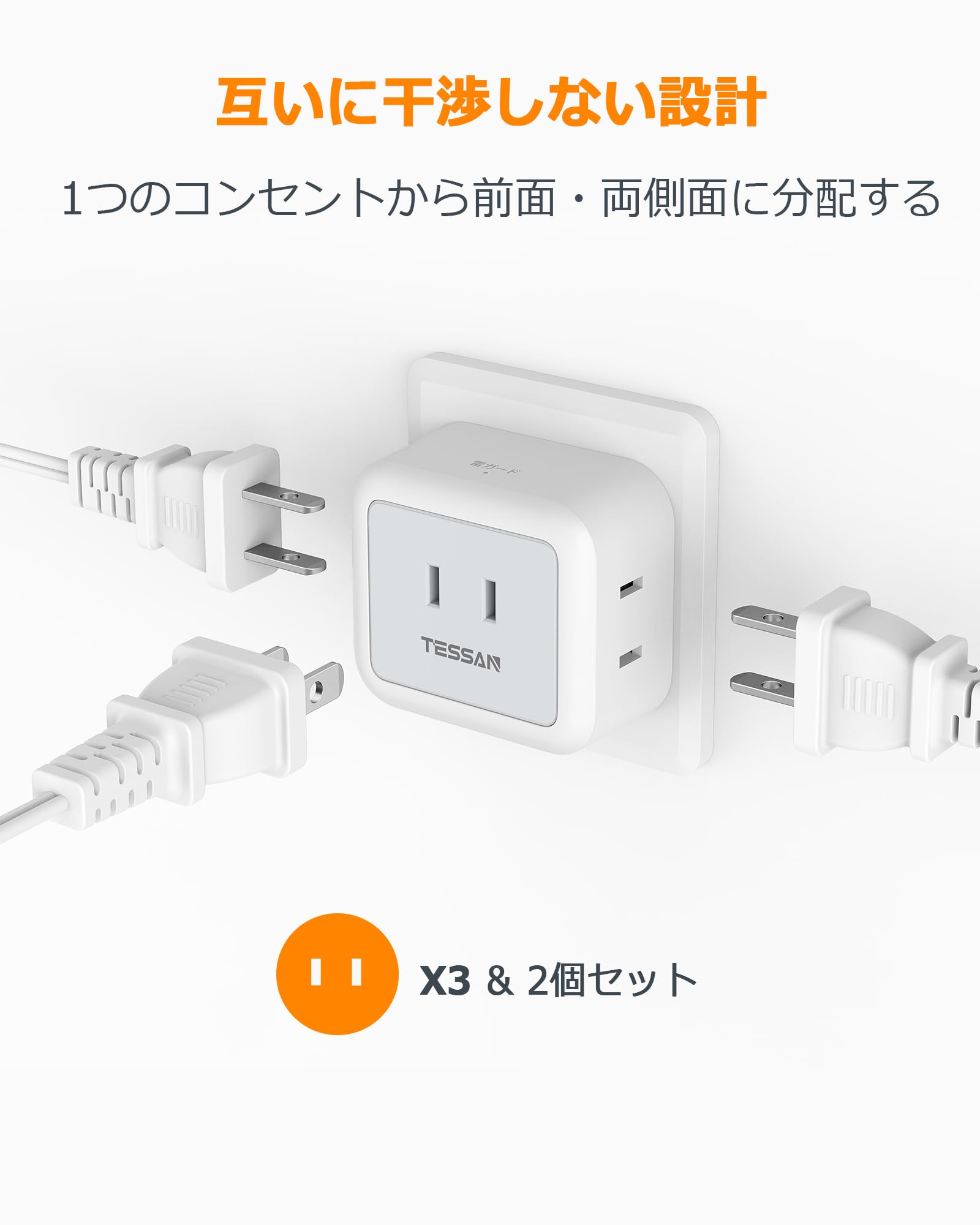 ■ 【互いに干渉しない蛸足コンセント】TESSANの電源式コンセントは違った方向に分岐していて、プラグ同士が邪魔にならない、大きな充電器を差しても隣の差込口に干渉しません。
