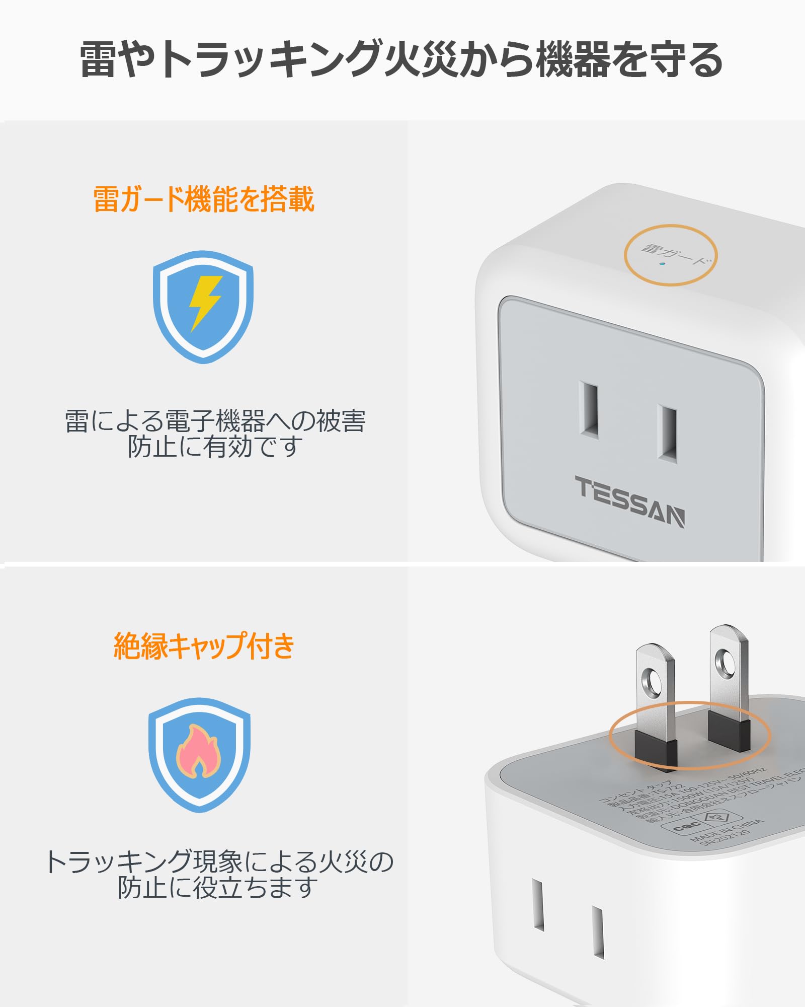 電源プラグには絶縁キャップが付いており、トラッキング火災の予防に役立ちます。