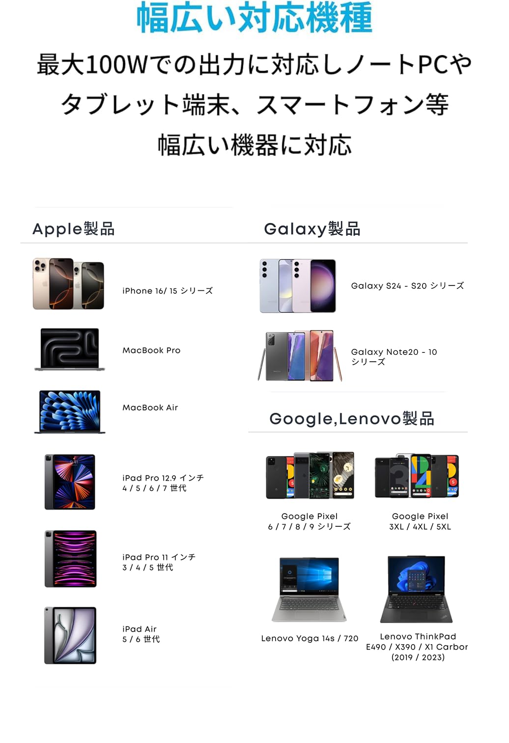■ 幅広い充電器に対応:USB Power Deliveryに対応し、幅広いUSB-C急速充電器から最大100Wの高出力でお使いの機器を充電可能です。
