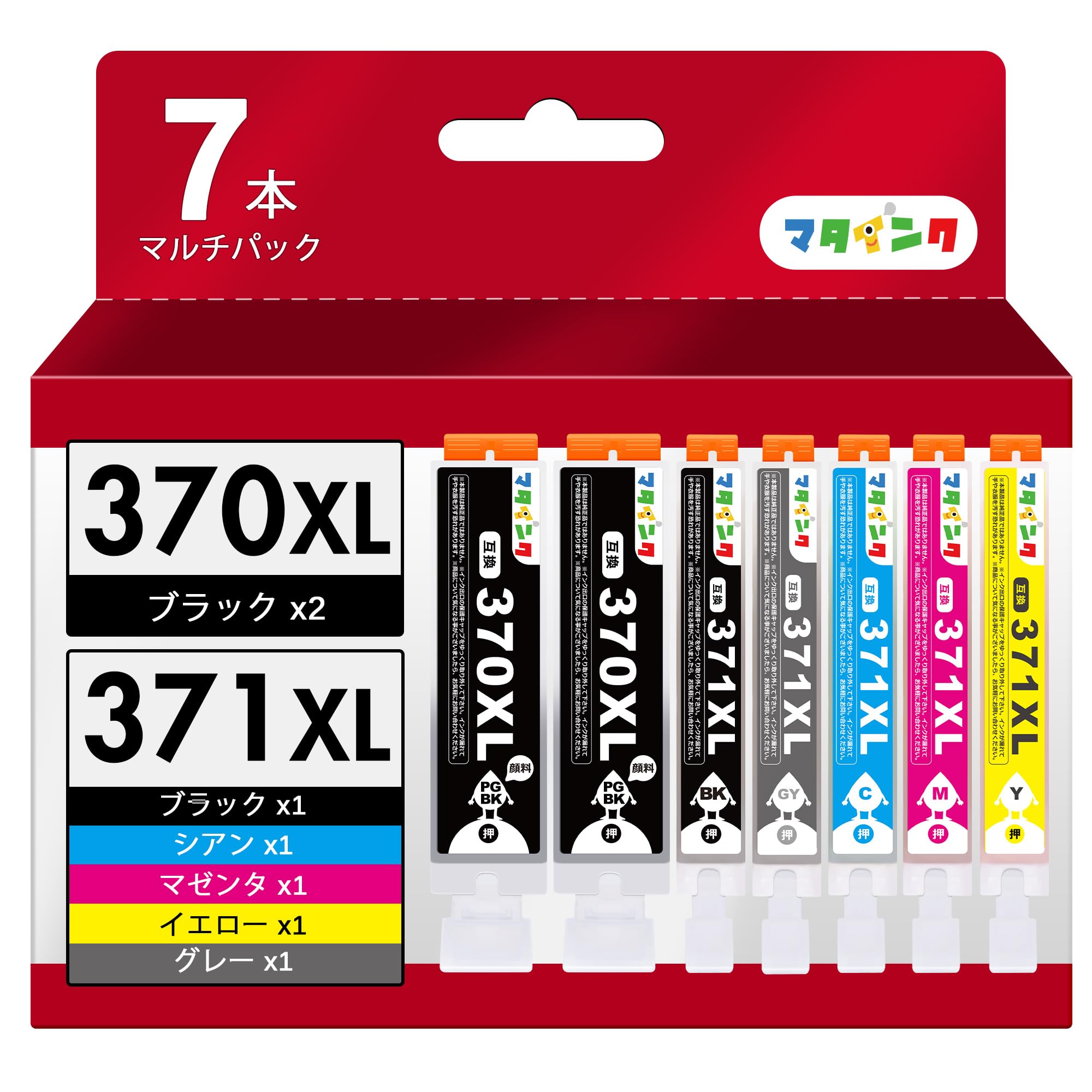 ■ 【セット内容】マタインクの キヤノン用 インク 371 370 7本セット 大容量タイプ には BCI-370XLPGBK ブラック 2本入り、BCI-371XLBK ブラック、BCI-371XLC シアン、BCI-371XLM マゼンタ、BCI-371XLY イエロー、BCI-371XLGY グレー 各1本があります。