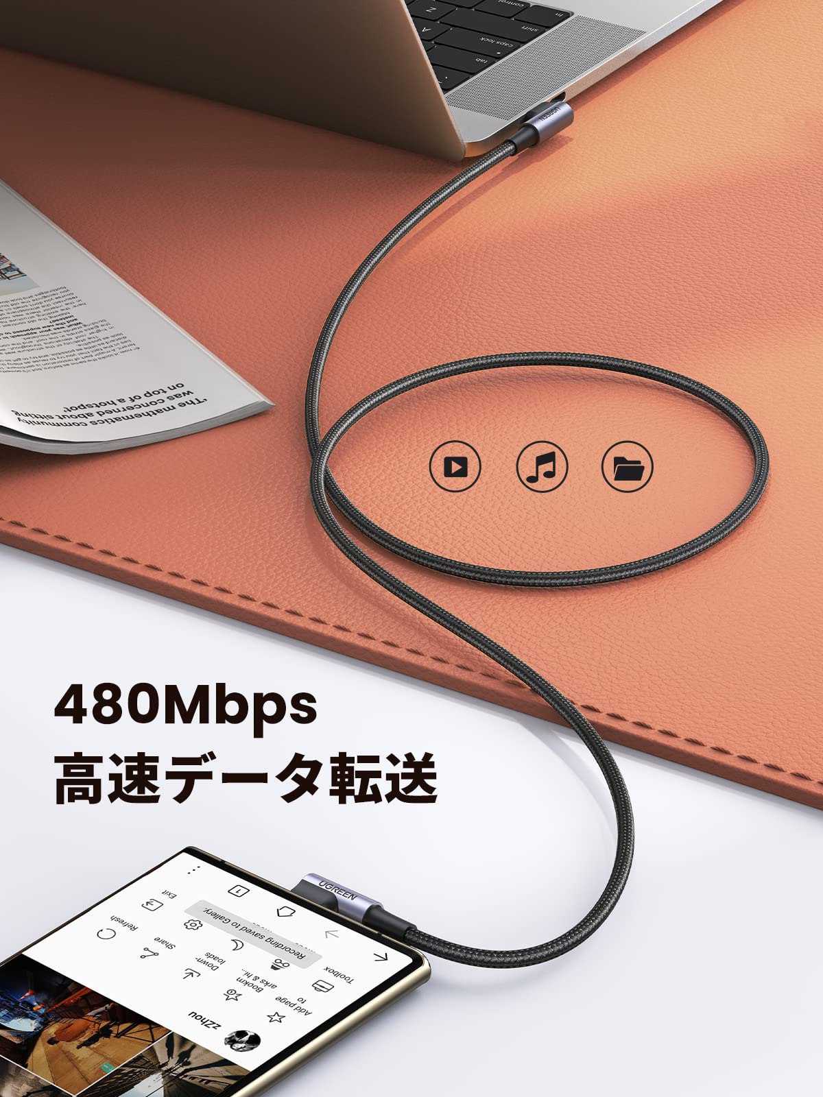 UGREEN 【L字型】 USB C ケーブル Type-c L字 60W/3A PD3.0急速充電 C to C ナイロン編み iphone17/16/15シリーズ/Mac Book/iPad/Galaxy/Google/Switch/ドローン等USB-C機器対応 【映像出力非対応】0.25M
