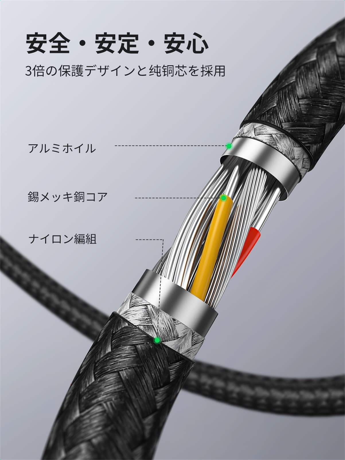 外部にはナイロン編み材料と耐摩耗性アルミニウムシェルにより、長期使用でも断線しにくいです。