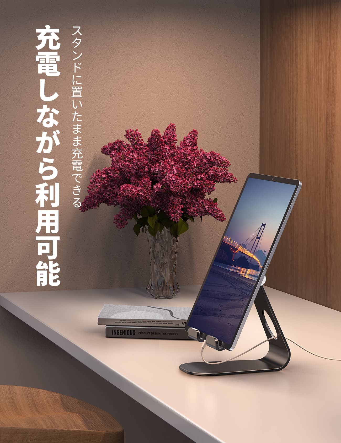 独創的な設計で、ケーブルを通すホール付き、ご端末を装着したままデバイスへの充電を行うことができる。