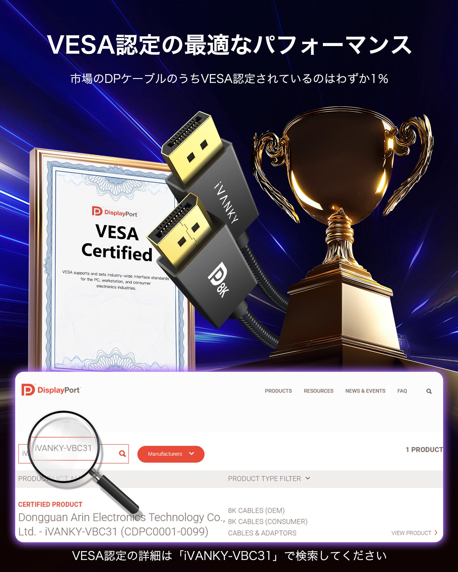 ■ 【VESA認証 32.4Gbps高速伝送】業界標準VESA認証を取得したディスプレイケーブル。