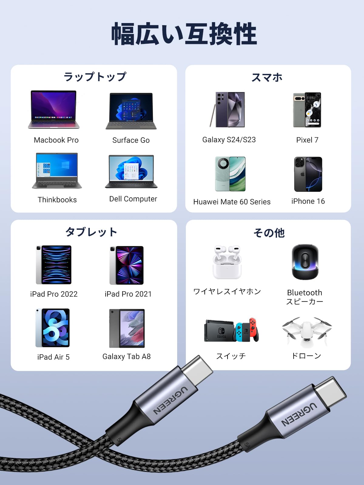 ■ 【幅広い互換性】 UGREEN usbc ケーブルはiPhone 16/15、MacBook Pro、Macbook Air、iMac、ChromeBook Pixel 、Dell XPS 、Moniteur 4k、 Galaxy S24、 Mate 20/ Mate 20 Pro/ P20/ P20 Pro/ Mate 10/ P10、HTC U11/ 10など様々なUSB type cデバイスに対応できます。