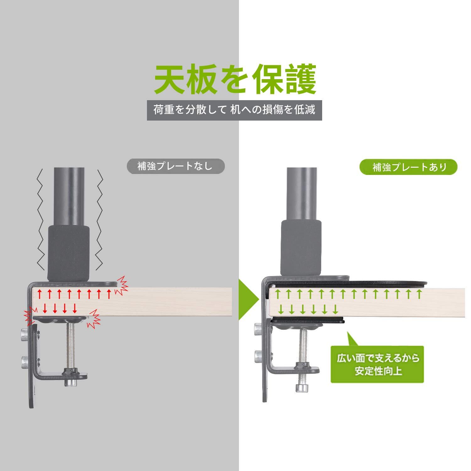 ■ 「硬さ強化」モニターアームだけ取付より、補強プレートの増設は天板保護の上、取付部の歪み、凹みやモニタアームが前へそり、左右へ傾きも軽減できます。