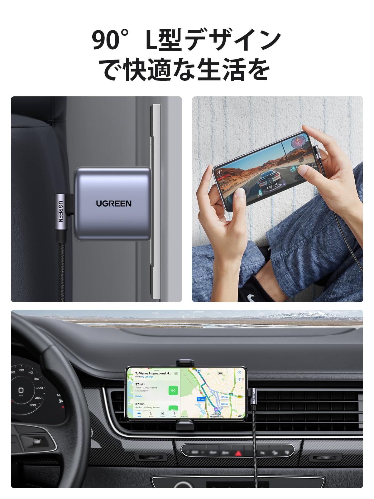 UGREEN USB C ケーブル L字 Type-c L型 PD 60W/3A 急速充電 断線防止ナイロン編み アンドロイド スマホ iphone17/16/15シリーズ/MacBook/iPad/Galaxy/Google/HP/Switch/ドローン等USB-Cデバイス対応-1M【ビデオ出力非対応】