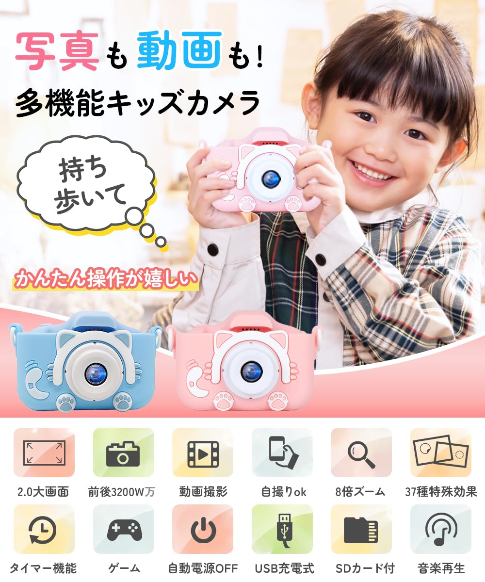 * 【ゲーム機能&保護ケース付きで安心・楽しい体験】このキッズカメラには、撮影以外にも楽しめるゲーム機能を搭載しており、遊びながら創造力を育むことができます。外出先でも飽きずに楽しめるので、お子様の長時間使用にもぴったり。さらに、耐衝撃性に優れた保護ケースが付属しており、落下や衝突による破損をしっかり防止。旅行やお出かけでも安心して使える子供用カメラです。可愛い見た目と高い実用性を兼ね備え、トイカメラ 女の子やトイカメラ 男の子としても人気の一台。家族の思い出を安全に、楽しく残せる頼もしい子供 カメラです。
