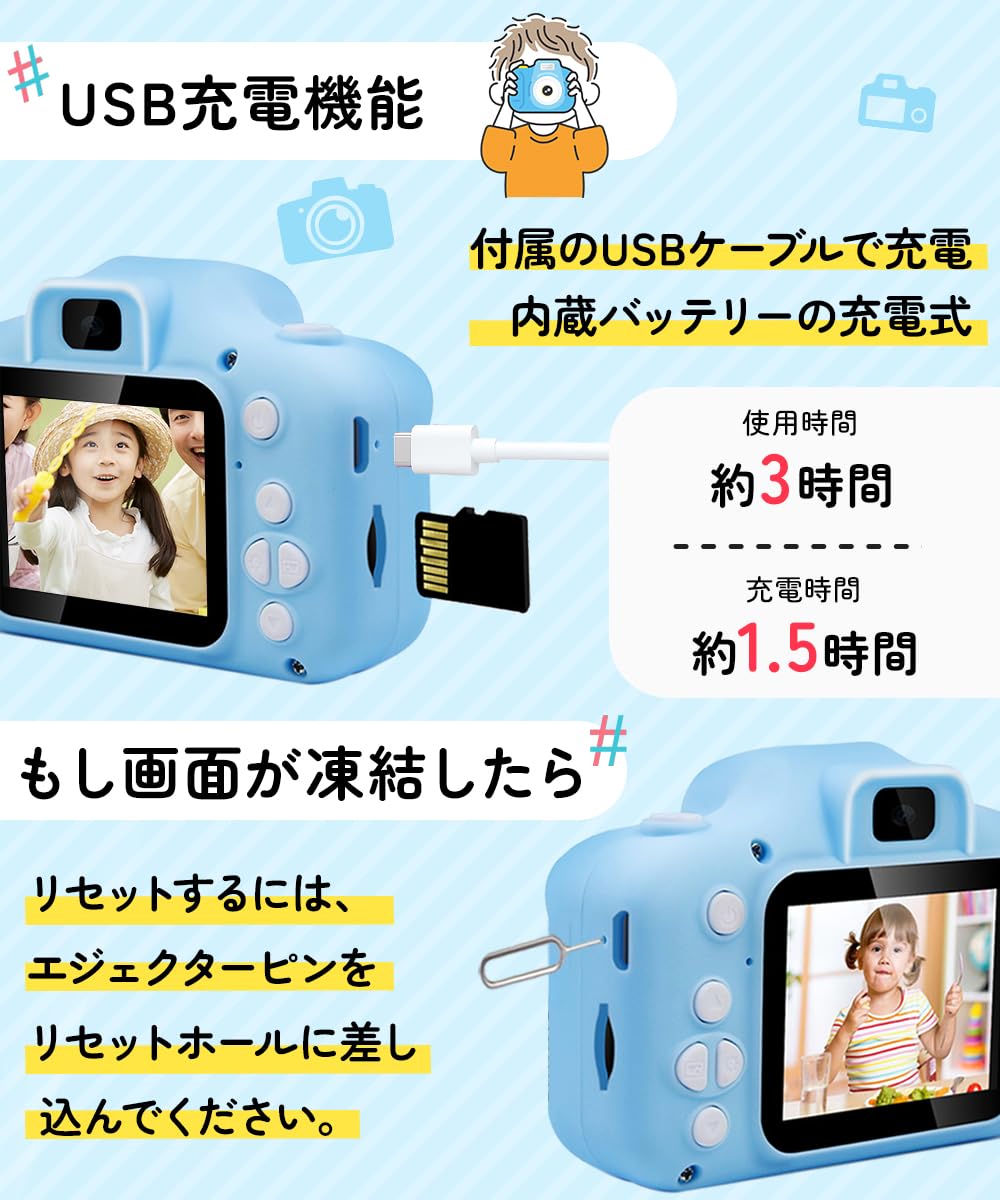 * 【多機能タイマー撮影&USB充電対応で便利さアップ】この子供 用 の カメラは、家族や友達との集合写真が簡単に撮れるタイマー撮影機能を搭載。設定した時間で自動撮影できるため、シャッターチャンスを逃さず、笑顔あふれる瞬間をしっかり記録できます。さらに録音機能にも対応しており、音声とともに楽しい思い出を保存できるキッズカメラです。USB充電式のため、パソコンやモバイルバッテリーから手軽に充電可能。外出先でも電池交換の手間がなく、どこでも撮影を楽しめます。また、日本語を含む多言語設定対応で、操作もわかりやすく、お子様や保護者の方も安心。付属品も充実しており、32GB SDカード・USBケーブル・ストラップ・USBカードリーダー・日本語取扱説明書がすべてセットになった、届いてすぐ使える便利な子供用カメラです。