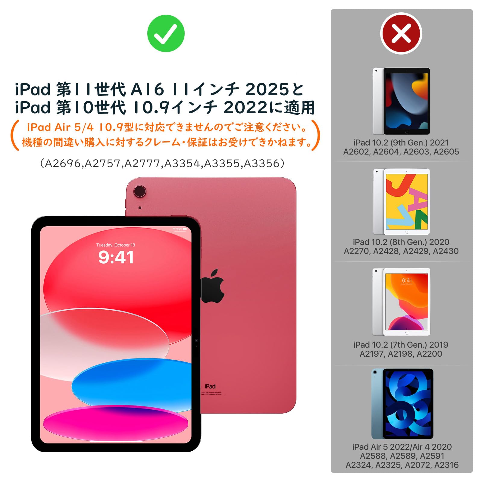 * 「対応機種」 New iPad (A16) 11インチ 第11世代(モデル番号:A3354/A3355/A3356)及び iPad 第10世代 2022 10.9インチ(モデル番号:A2696/A2757/A2777)向けに専用設計された半透明バックケースです。iPad Air 11 第7世代(M3)(×)、iPad Air 11 第6世代(M2)(×)、iPad Air 10.9インチ 第5/4世代(×)、又は他の機種に適用出来ませんので、ご購入の前にお手元のタブレット機種をご確認ください。