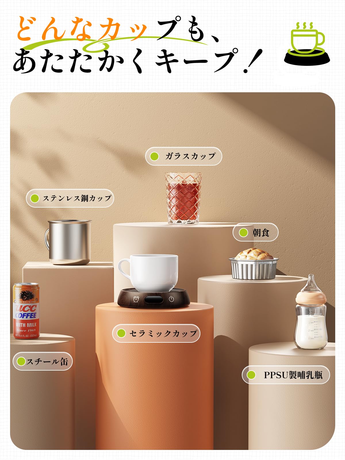 缶コーヒー・陶器カップ・ステンレスマグ・味噌汁椀・哺乳瓶など、あらゆる容器に対応!仕事中のホットドリンクはもちろん、食事中のスープや就寝前のミルクまで、これ一台で冬の毎日を快適に温めます。