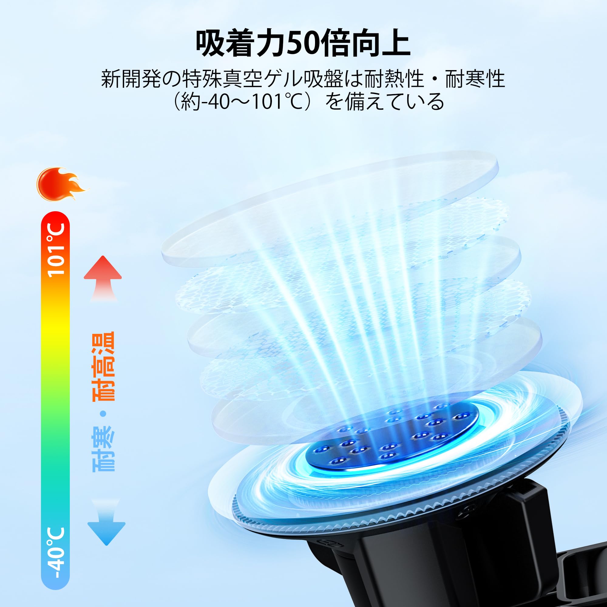 この課題を解決するため、弊社は吸盤サイズを従来より「1.5倍」に大きくすることで急ブレーキや悪路走行時でもタブレットが落下せず、抜群の安定性を実現しました。
