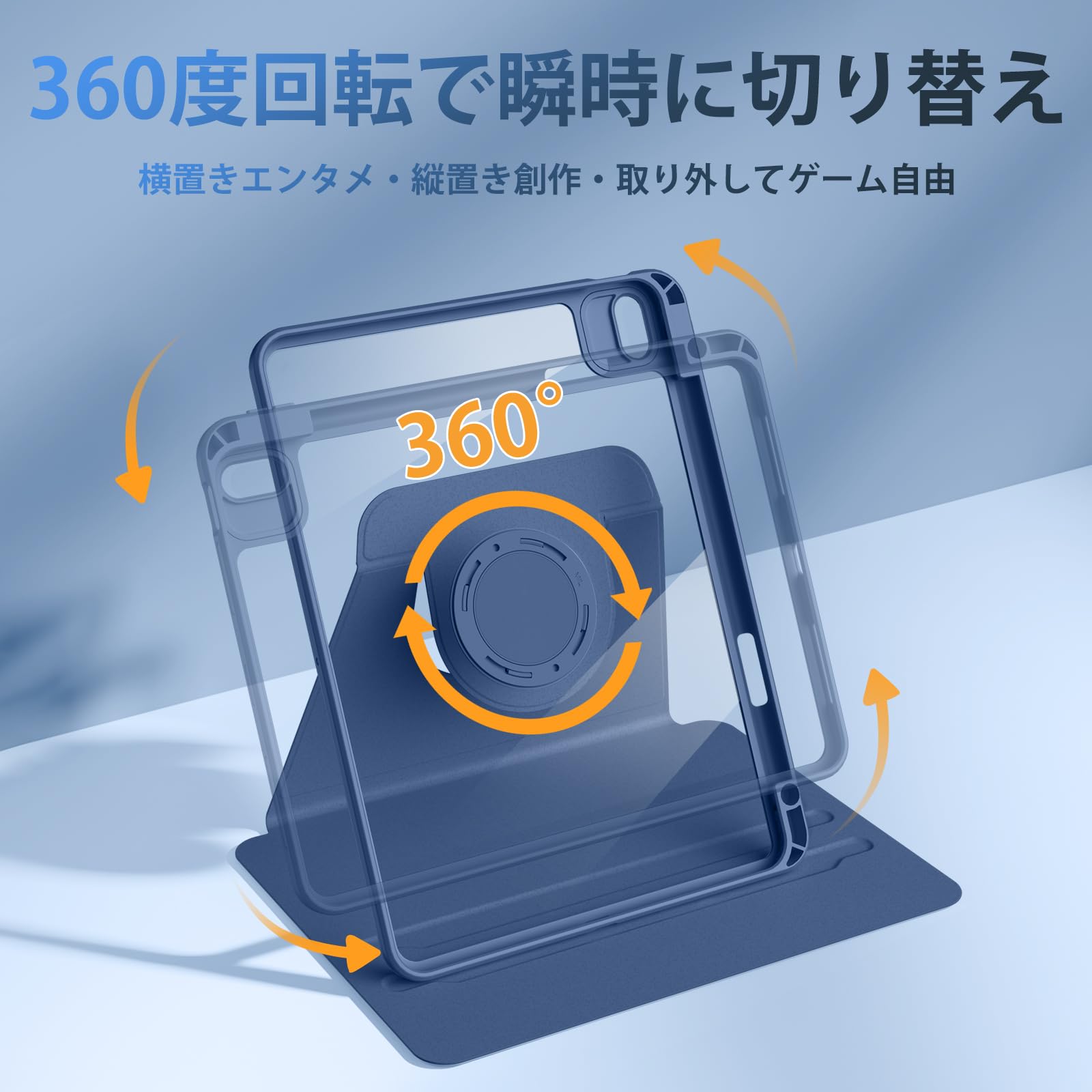 ■ 「360°回転機能 」カバーを折れる仕様にデザインして、横向きと縦向きの二つの置く角度調整できて、同時に、蓋を外して、冷蔵庫などの金属面に貼り付けられる機能もあり、両手解放で動画観賞や、タイピング、ゲームなども快適にご利用頂けます。