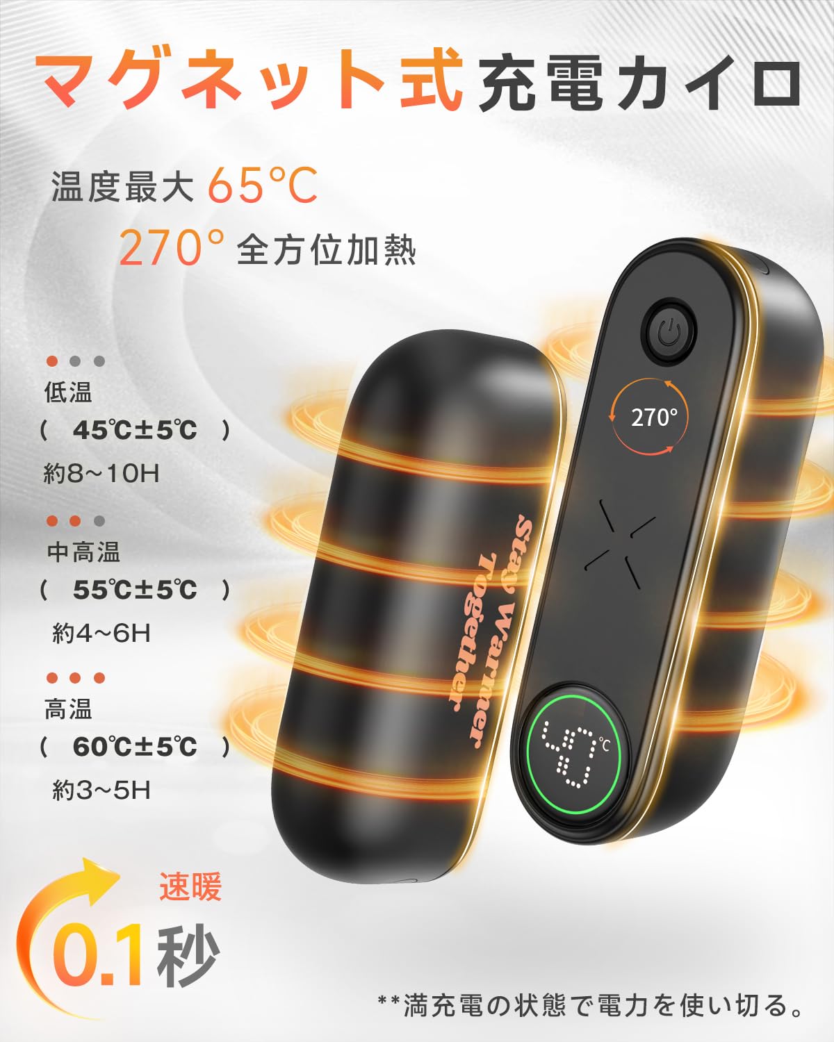 ■ 【1秒発熱&3段階温度調節で、すぐにちょうどいい温かさ】マグネット分離式デザインを採用したこの充電カイロは、本体の着脱が簡単。