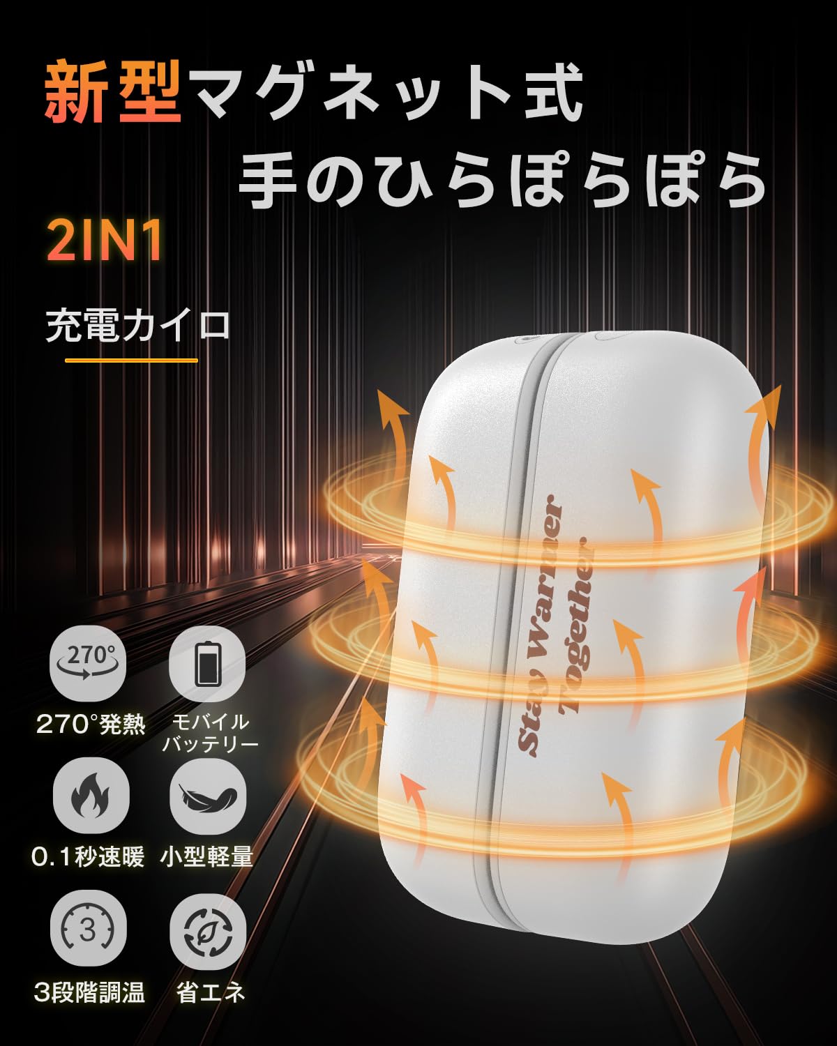 ■ 【1秒発熱&3段階温度調節で、すぐにちょうどいい温かさ】マグネット分離式デザインを採用したこの充電カイロは、本体の着脱が簡単。