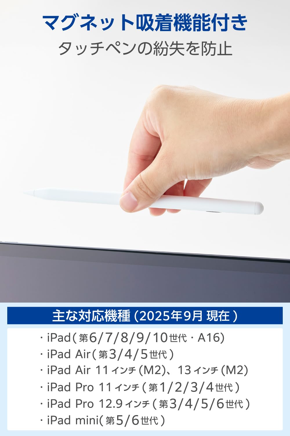 エレコム タッチペン デジタルインジケーター 【iPad A16、 iPad7/8/9/10、 iPad Pro 11/12.9/13インチ、 Air3/4/5/11・13インチ、 mini5/6に対応】 iPad専用 ペンシル 急速充電 パームリジェクション 傾き検知 20分でフル充電 磁気吸着 USB-C充電 P-TPACSTAP12WWH