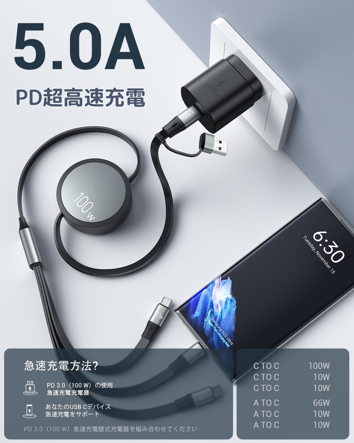 USB-C to USB-Cケーブルは最大100Wの充電速度を提供し、Samsung Galaxy S23/S22を30分で80%まで充電可能です。