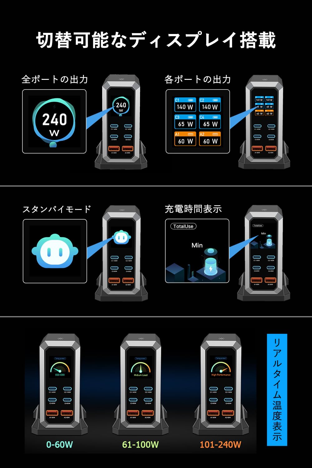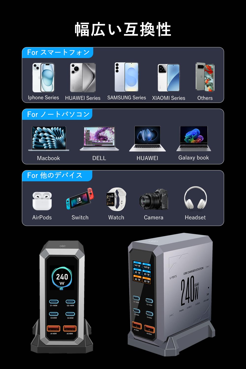 ■ 【NEWモデル240W充電ステーション】縦型デザインのマルチポート充電器は、140W充電対応のUSB-Cポート2つ、65W充電対応のUSB-Cポート2つ、60W充電対応のUSB-Aポート2つを搭載し、まとめで240Wの高出力充電を提供します。