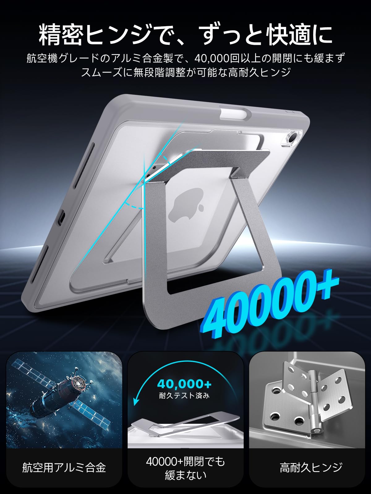 スタンド部分には航空機グレードのアルミニウム素材を使用し、独自の「トラホールド」ヒンジ構造により、約40000回の開閉テストをクリア。
