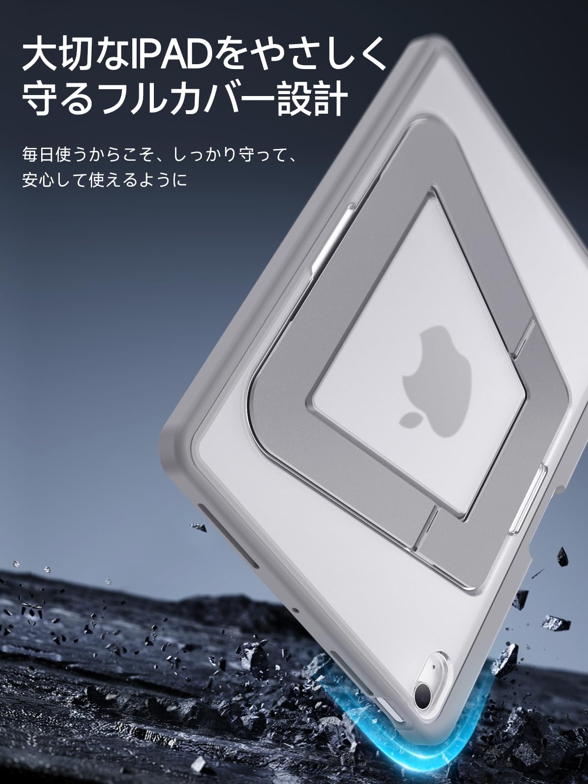 【米軍MIL規格・縦置き/横置きスタンド】 iPad Air 11インチ ケース M3(2025)・M2(2024)対応 iPad Air 第5/4世代(2022/2020)専用カバー アルミ調節式 縦横スタンド ペンシルホルダー付き 薄型 軽量 耐衝撃 半透明カバー (グレー)