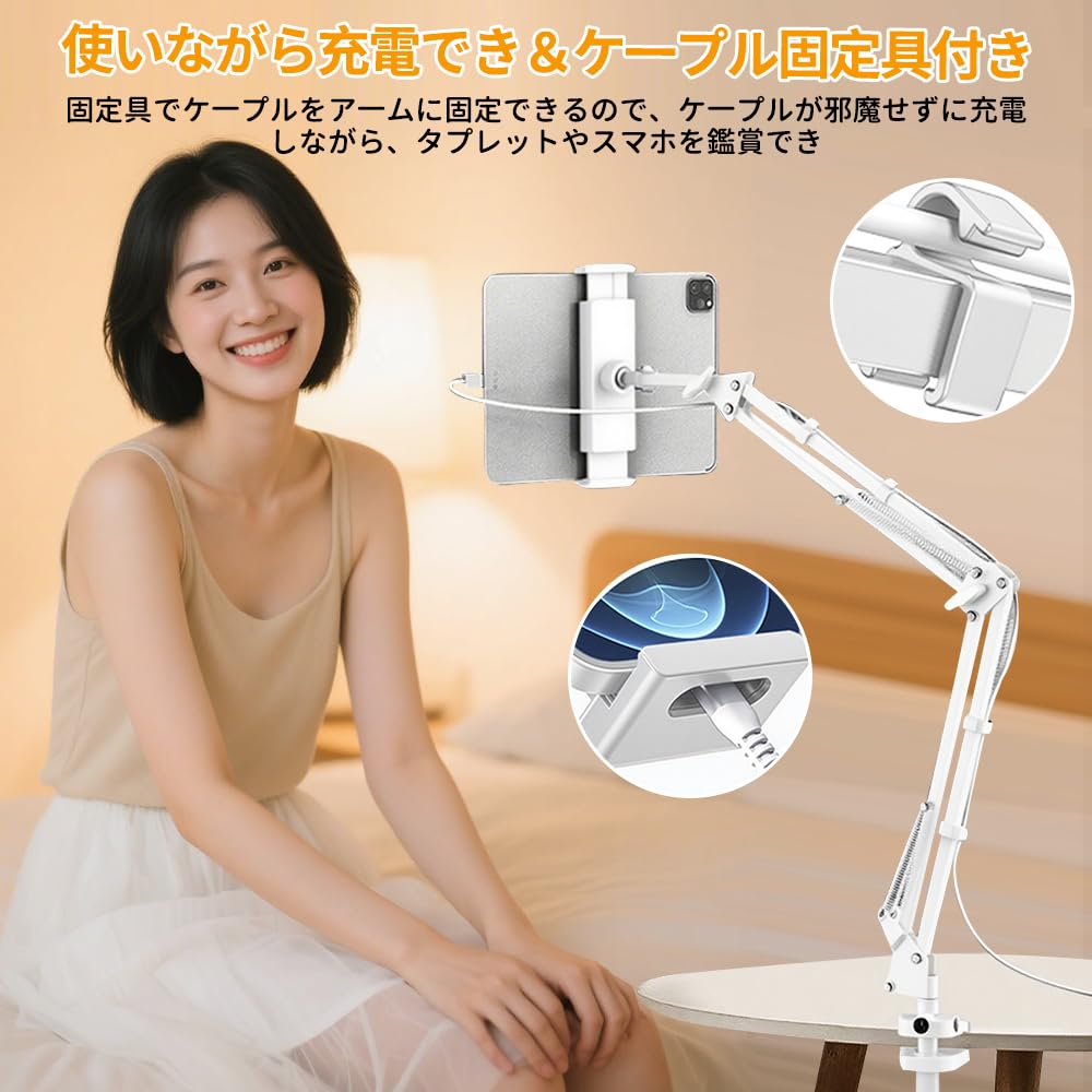 タブレットスタンド【2025最新型5穴土台&ケーブル固定具付き】寝ながら スマホスタンド 4つの関節 折り畳み式 自由角度調整 卓上スタンド 360°回転ホルダー 縦横両対応 4-12.9インチの iPad/iPhone/Surface/Galaxy/mini/Kindle/Switchに対応 (白)