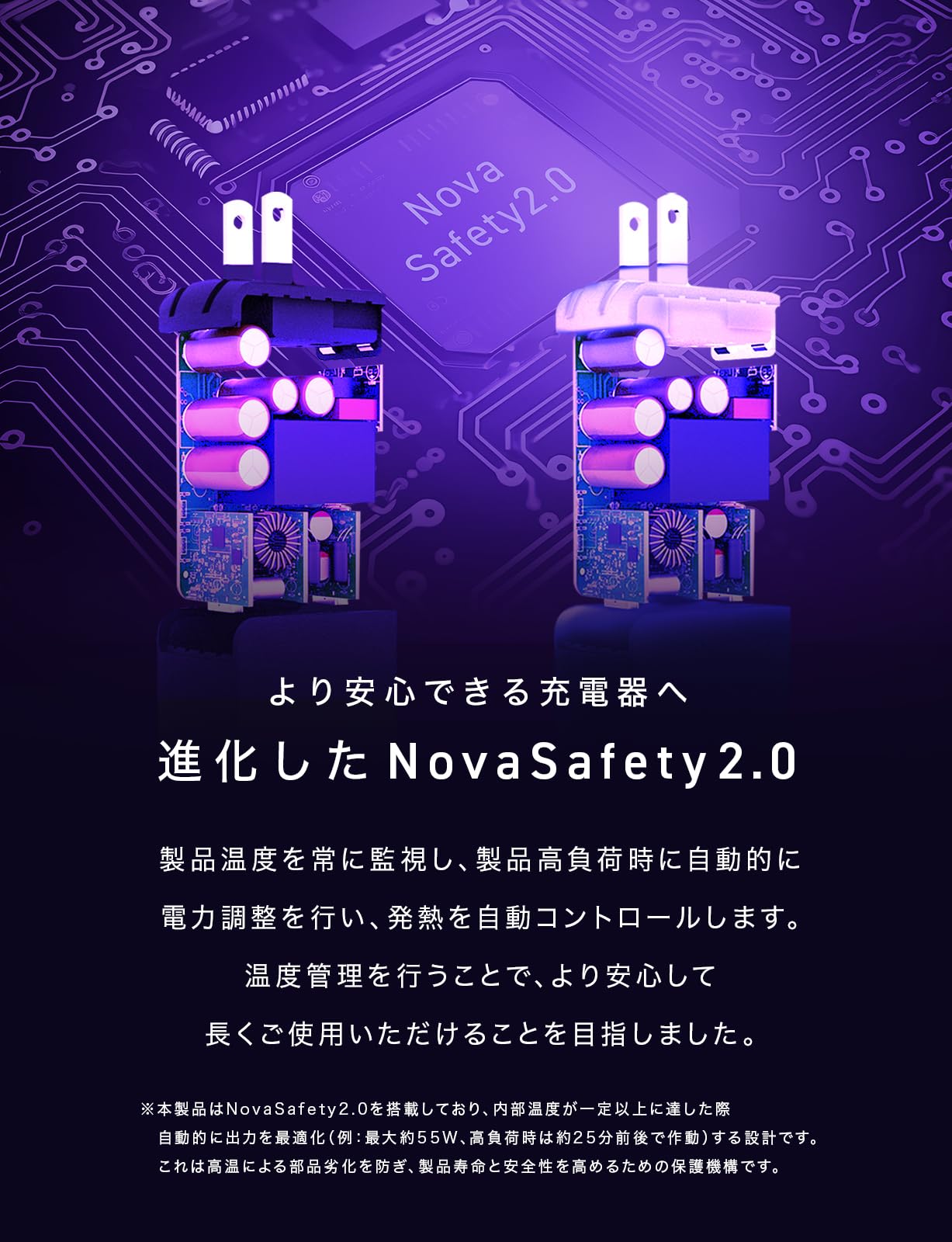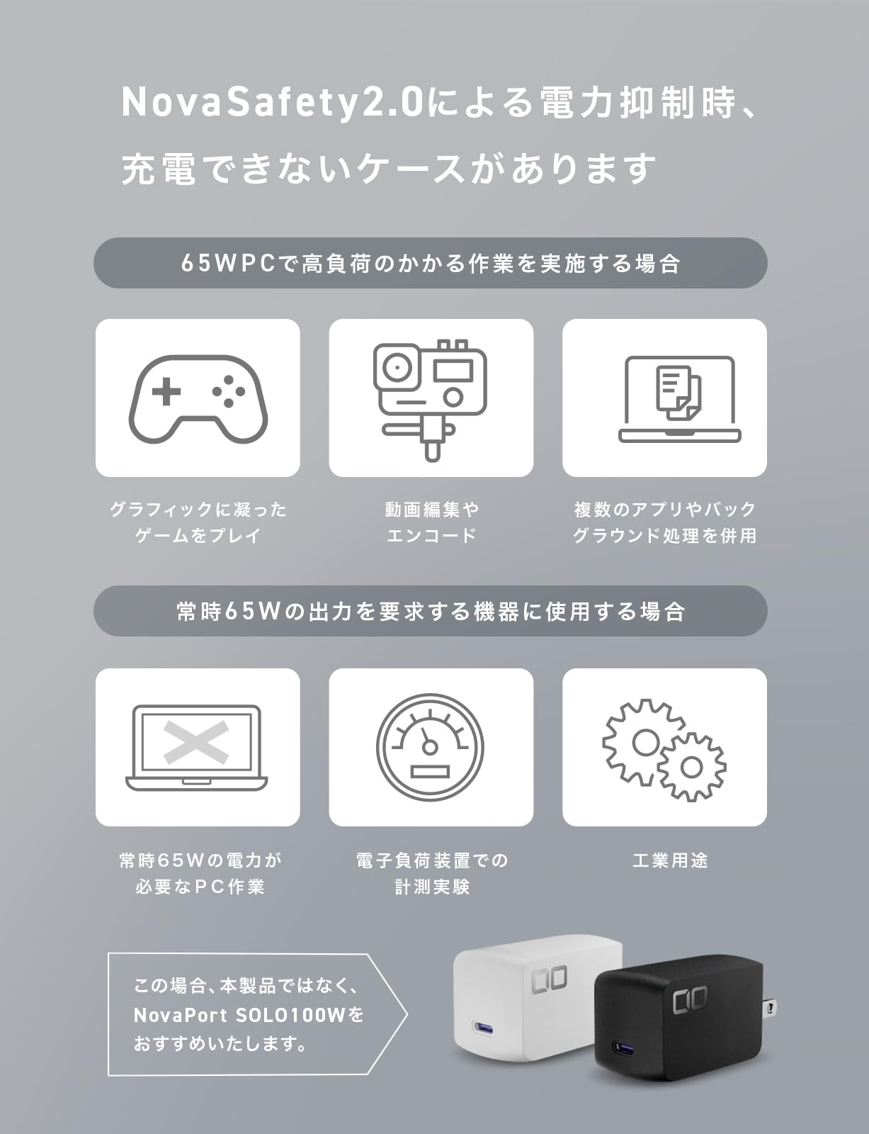ノートPCやスマートフォンなどのデバイスでは、充電開始時に高出力が必要ですが、一定時間経過後はデバイス側の電力要求が下がるため、NovaSafety2.0によっても充電速度への影響はほとんどありません。