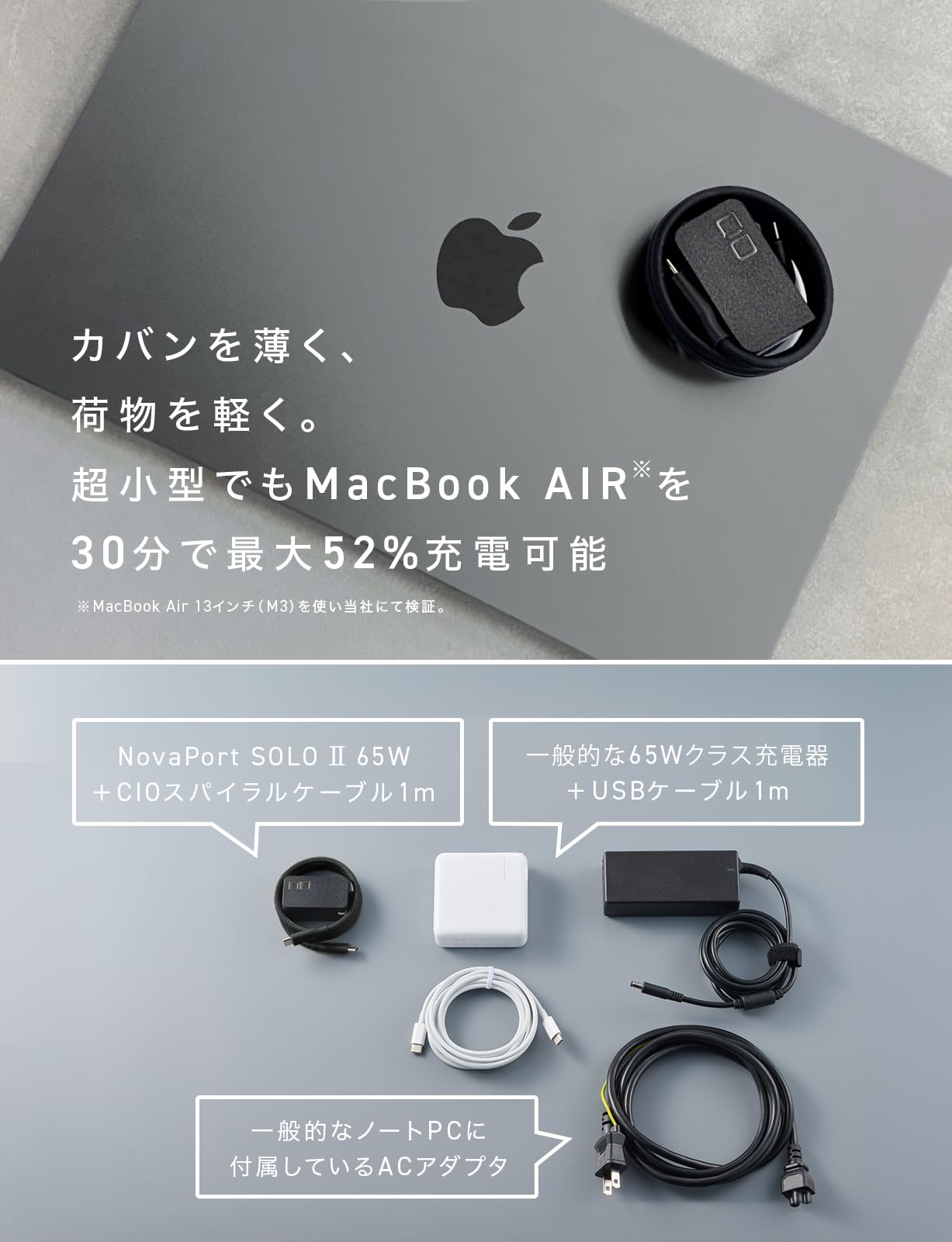 CIO NovaPort SOLOⅡ 65W USB-C急速充電器【世界最小級 / NovaSafety2.0搭載・動作時 最大55W】単ポート PD対応 ACアダプター ノートPC/iPhone 17 / 16 / 15 / Android/MacBook/iPad向け (ブラック)