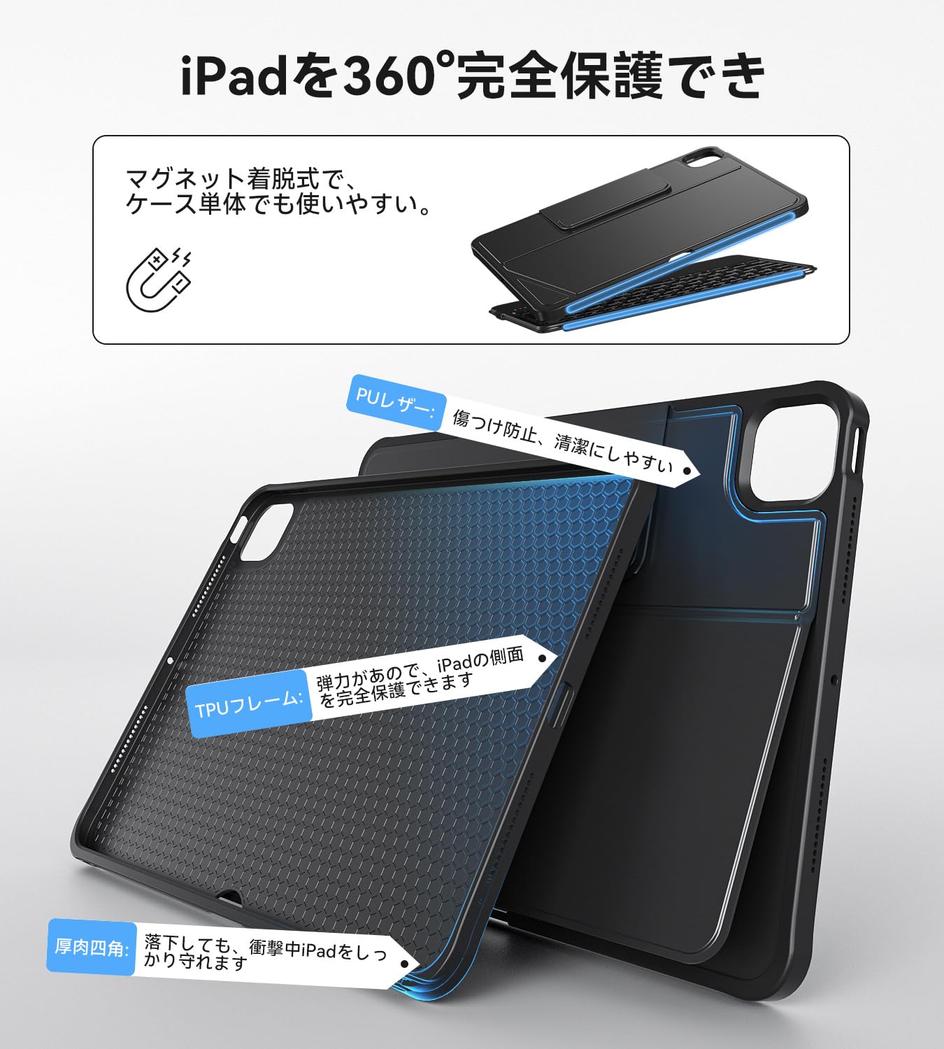 ■ 【分離使用可&横/縦置き可能】ipad air 11インチ キーボード ケース は磁石吸着設計で、簡単に脱着でき、ipad ケースとして単独使用できます。